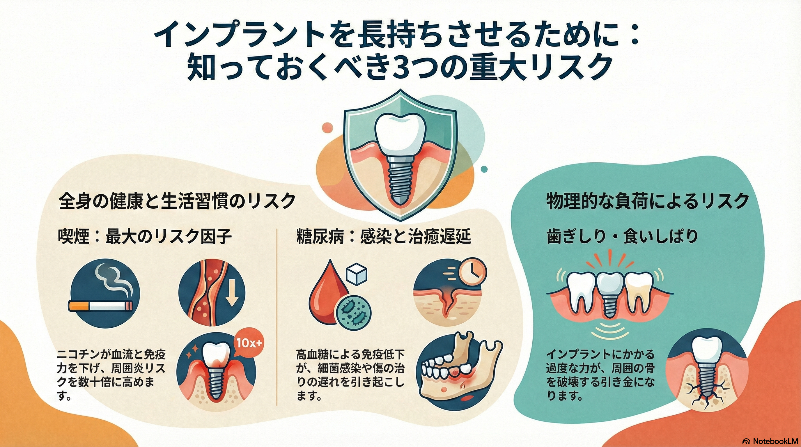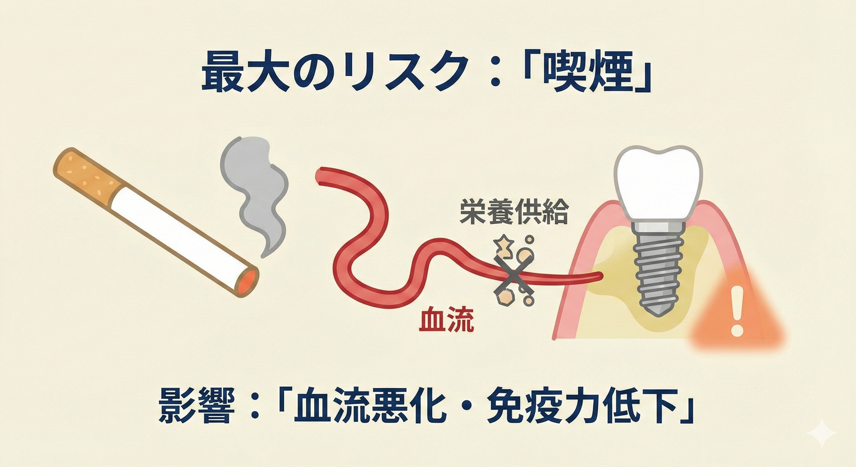 喫煙: タバコは最大のリスク因子です。ニコチンが血流を悪くし、免疫力を下げるため、インプラントと骨の結合を阻害し、周囲炎のリスクを数倍から数十倍に高めます。当院でも、治療期間中および術後の禁煙を強く推奨しています