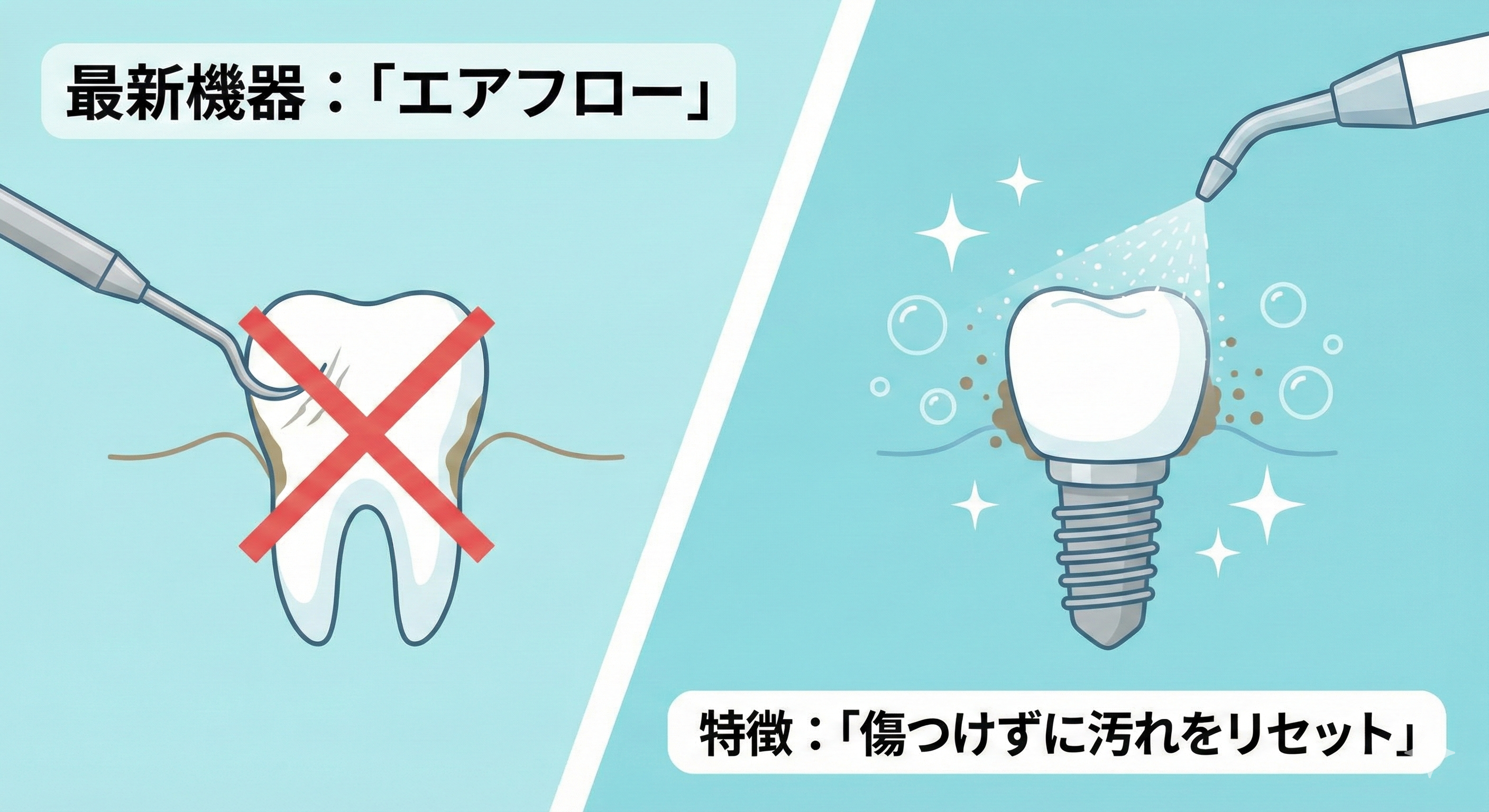 そこで当院では、「エアフロー」という最新機器を導入しています。微粒子パウダーをジェット噴射で吹き付けることで、インプラントを傷つけることなく、微細なバイオフィルム(細菌の膜)や汚れを短時間で根こそぎ除去します