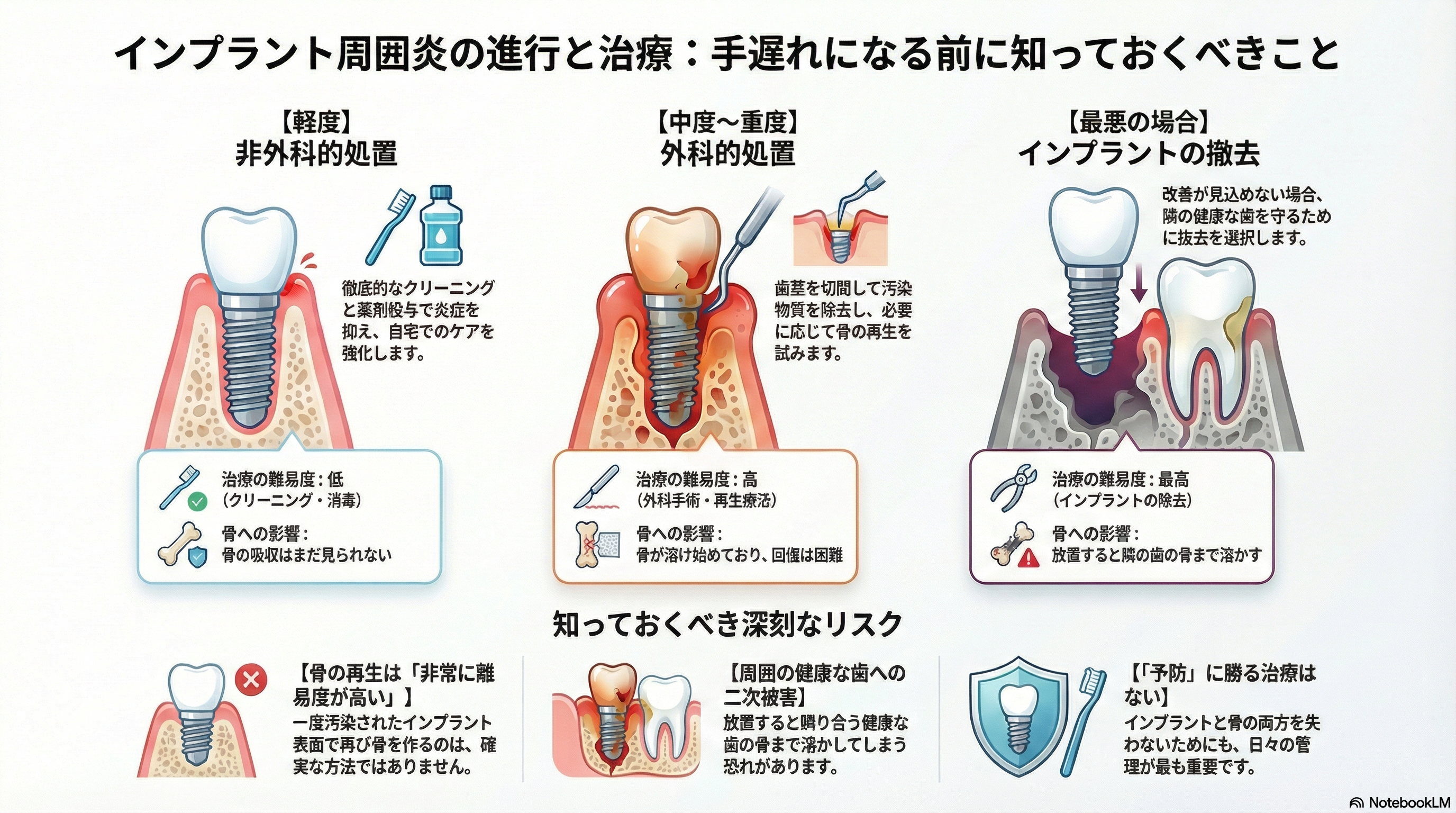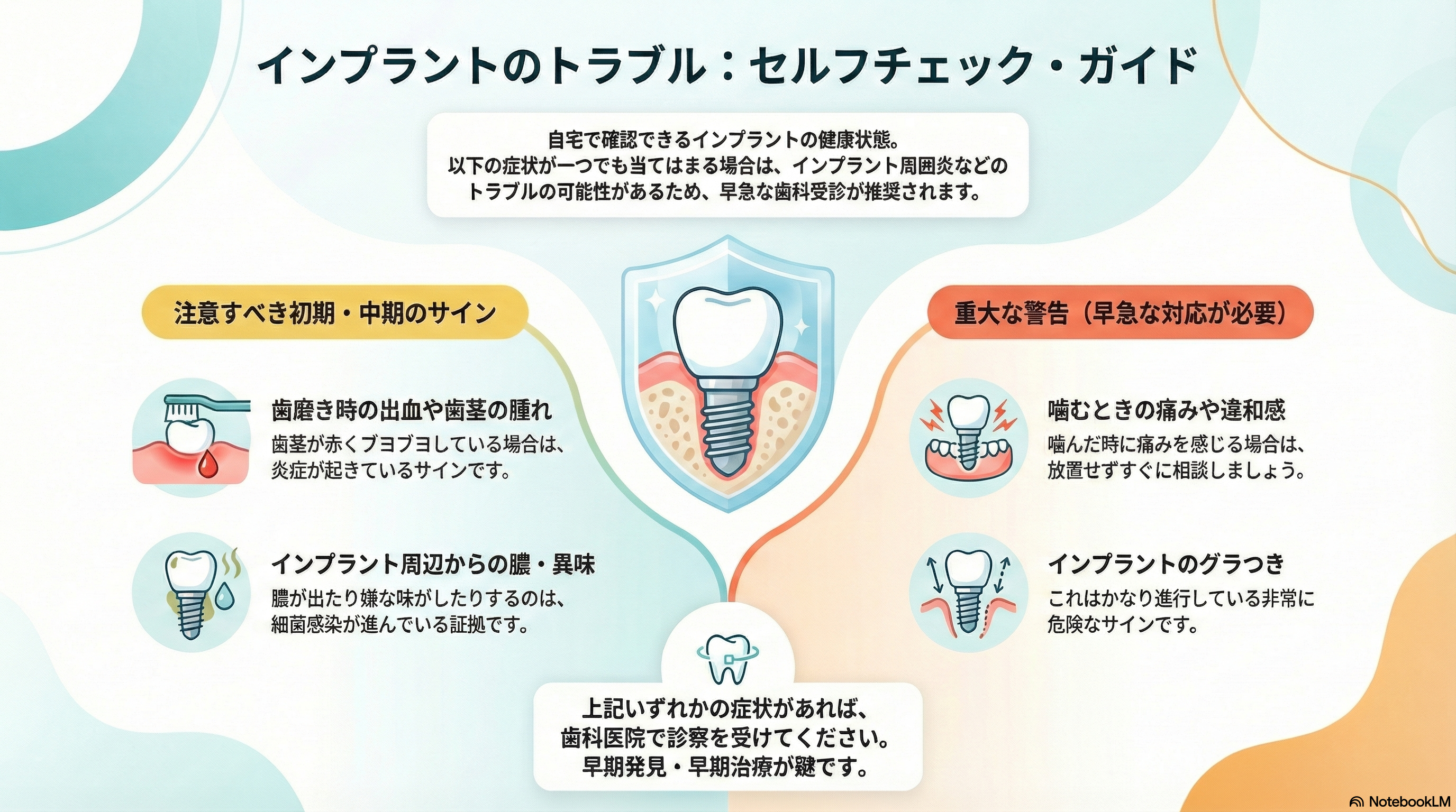 もし今、インプラント周辺にこのような違和感を感じているなら、決して放置してはいけません。それは**「インプラント周囲炎」**のサインかもしれないからです。