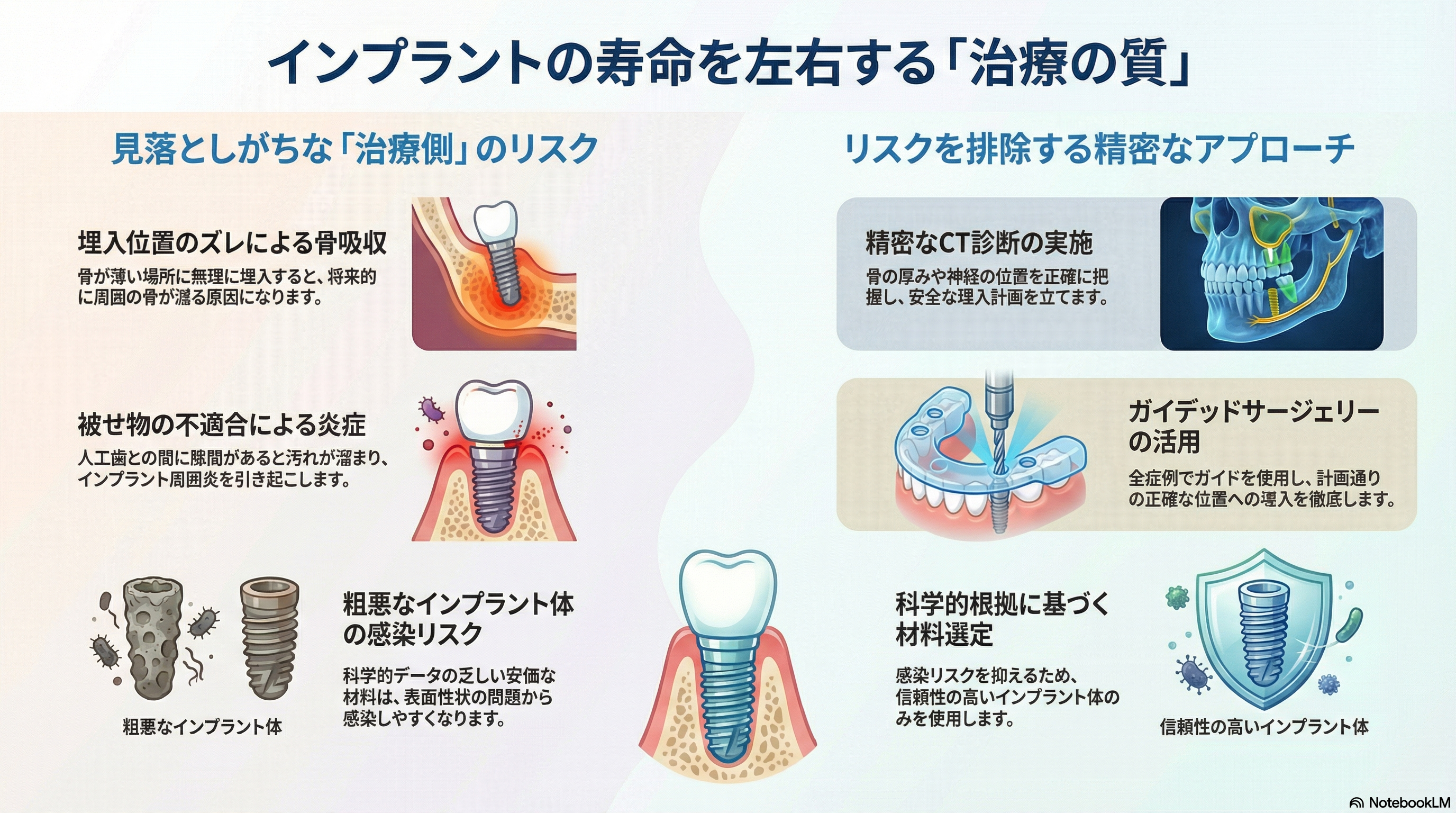 当院では、こうした「治療側の要因」によるリスクを排除するため、精密なCT診断やガイデッドサージェリー(ガイド手術)を全症例で実施しています