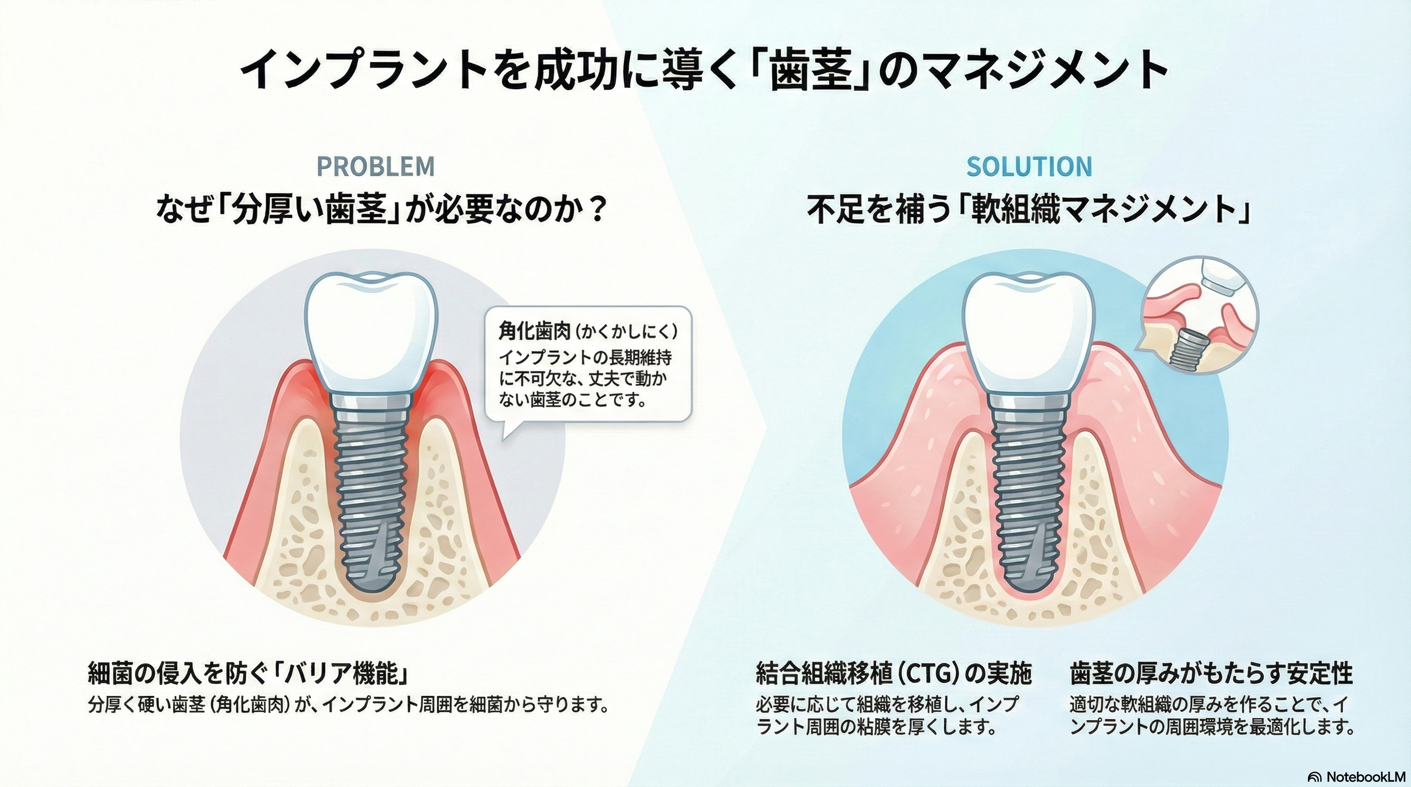骨だけでなく、インプラントを取り囲む「歯茎(軟組織)」の状態も重要です。分厚くて硬い歯茎(角化歯肉)があれば、それがバリアとなって細菌の侵入を防いでくれます。 当院では、必要に応じて結合組織移植(CTG)などを行い、インプラント周囲の粘膜を厚くする処置を行っています