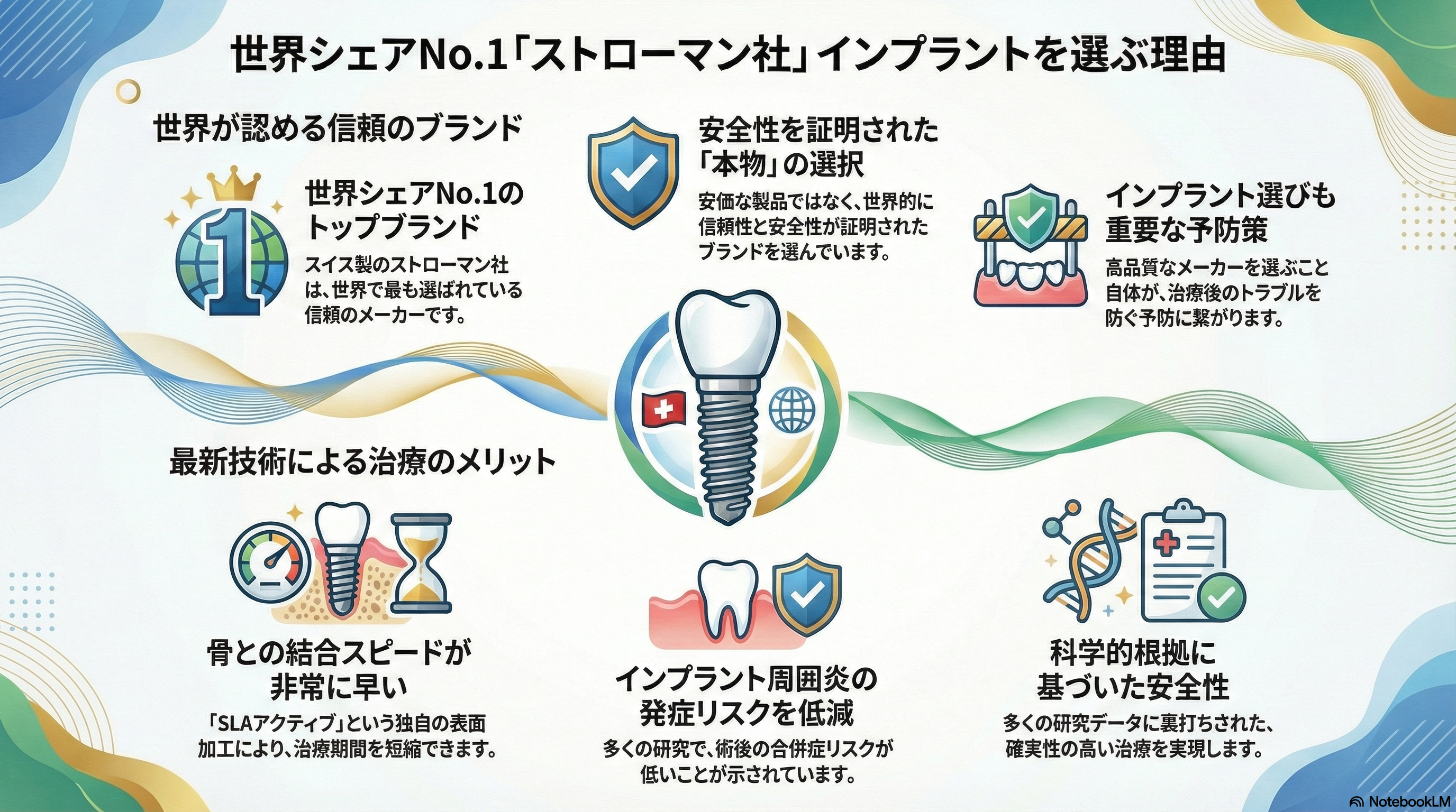 使用するインプラントの品質もリスクに関わります。当院では、世界シェアNo.1の「ストローマン社(スイス製)」のインプラントを採用しています