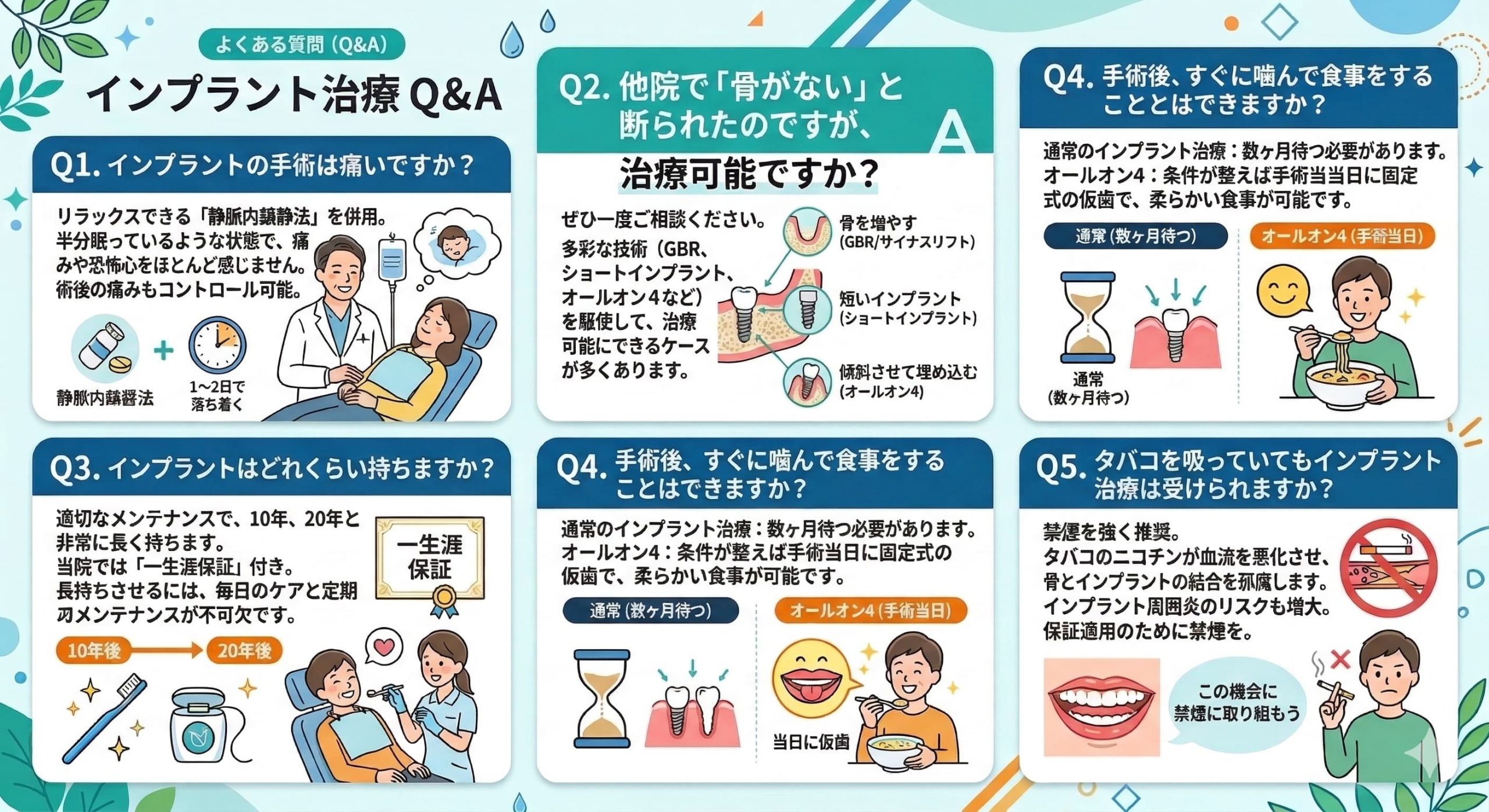 Q5. タバコを吸っていてもインプラント治療は受けられますか? インプラント治療を成功させるためには、禁煙を強く推奨しています 。タバコに含まれるニコチンなどが血流を悪化させ、骨とインプラントが結合するのを邪魔してしまうからです 。また、術後のインプラント周囲炎のリスクも跳ね上がります 。当院の保証制度を適用するためにも、この機会にぜひ禁煙に取り組んでいただくことをお勧めしています 。