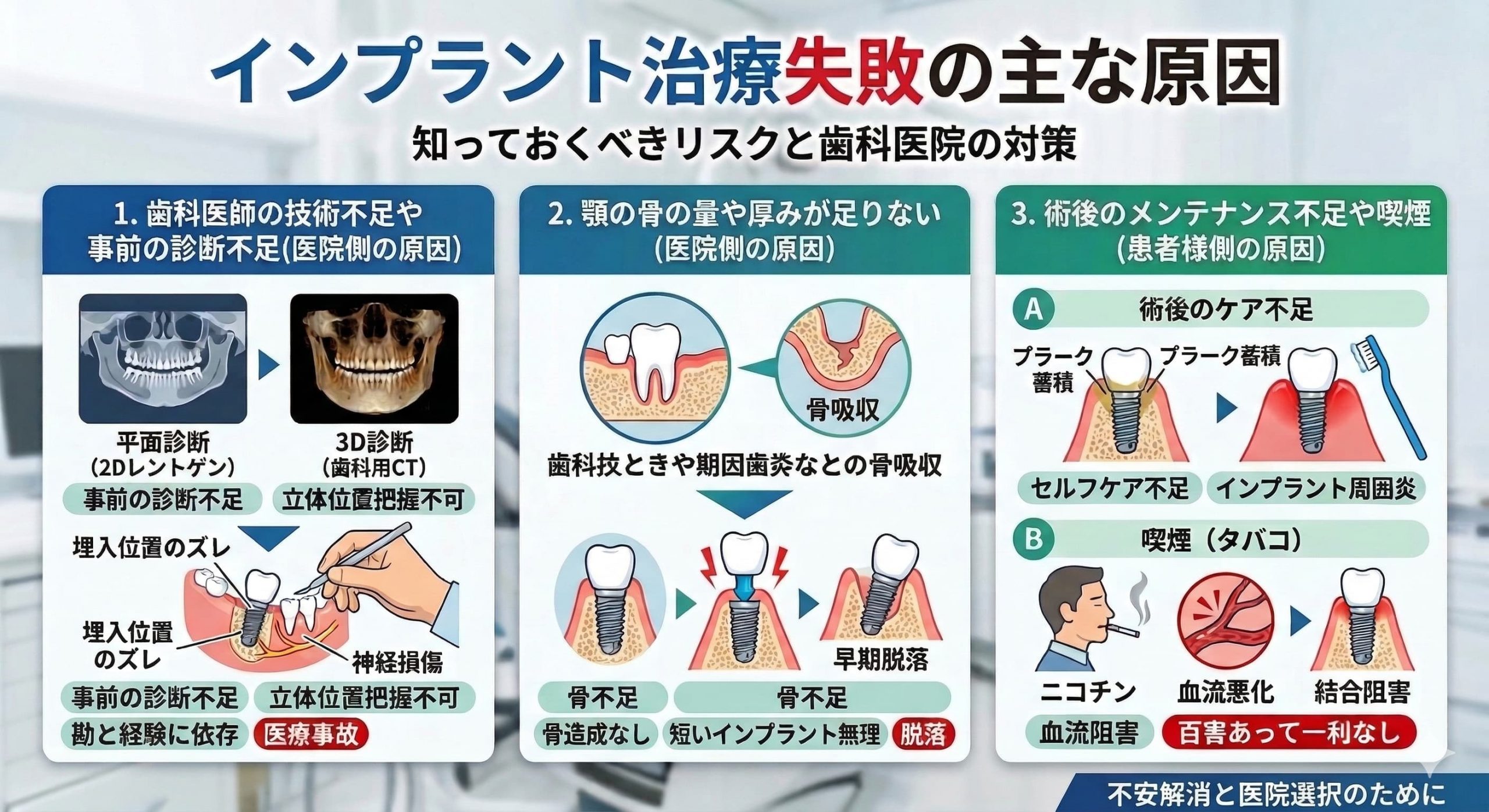 前述したような恐ろしいリスクは、なぜ現実の「失敗」として引き起こされてしまうのでしょうか。その背景には、歯科医院側の問題と、患者様側の生活習慣に関する問題の両方が存在します。