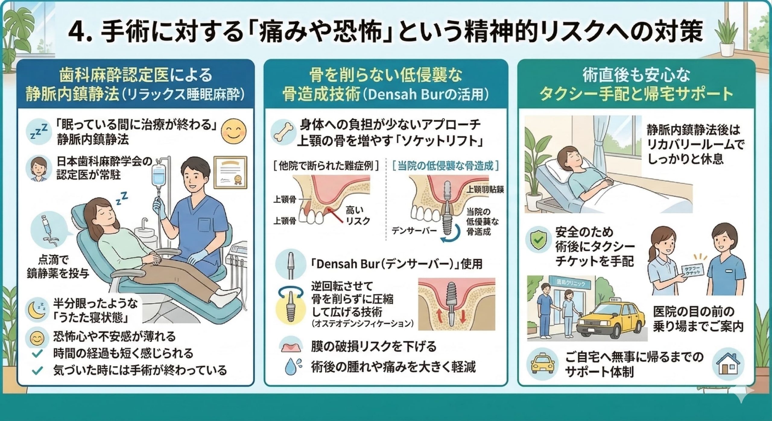 静脈内鎮静法を受けた後は、安全のためリカバリールームでしっかりと休息していただきます 。それでも少しふらつきが残る場合があるため、当院では術後にタクシーチケットを手配し、医院の目の前にある乗り場までスタッフがご案内しています 。手術中だけでなく、無事にご自宅へ帰るまでのサポート体制を整えています 。