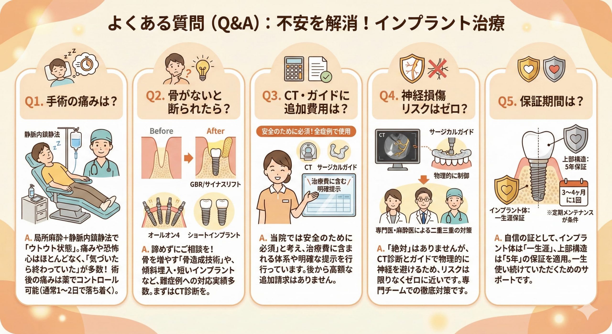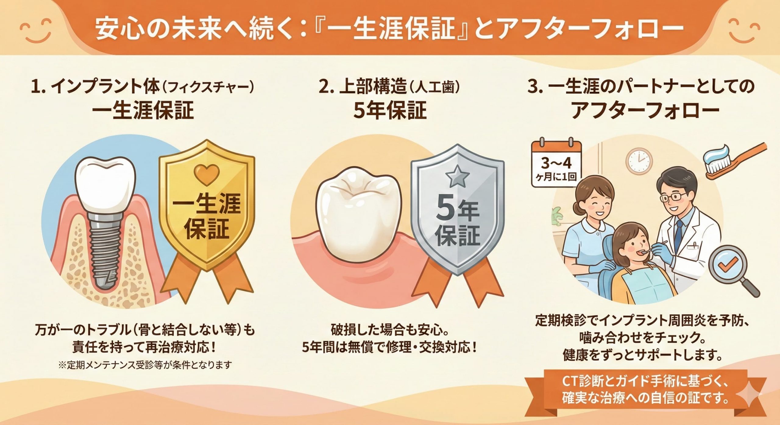 安全な手術を行うことはゴールではなくスタートです。当院では、CT診断とガイド手術に基づいた確実な治療を行っているという自信の表れとして、非常に手厚い保証制度を設けています。
