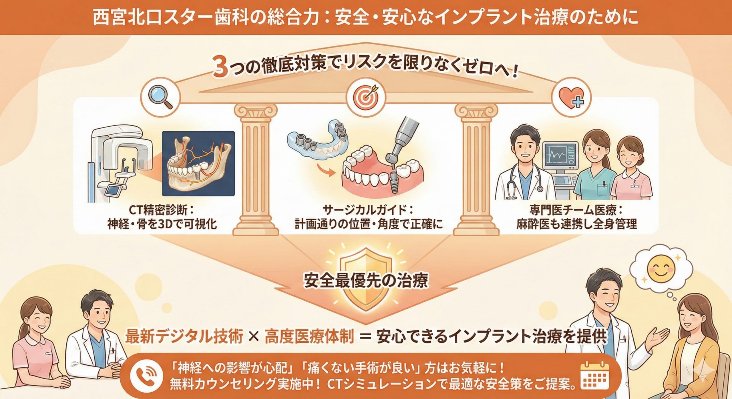 西宮北口スター歯科では、患者様の安全を何よりも優先し、最新のデジタル技術と高度な医療体制で、安心できるインプラント治療を提供しています。「神経への影響が心配」「痛くない手術を受けたい」とお考えの方は、ぜひ一度当院の無料カウンセリングにてご相談ください。CT撮影によるシミュレーションで、あなたに最適な安全策をご提案いたします。