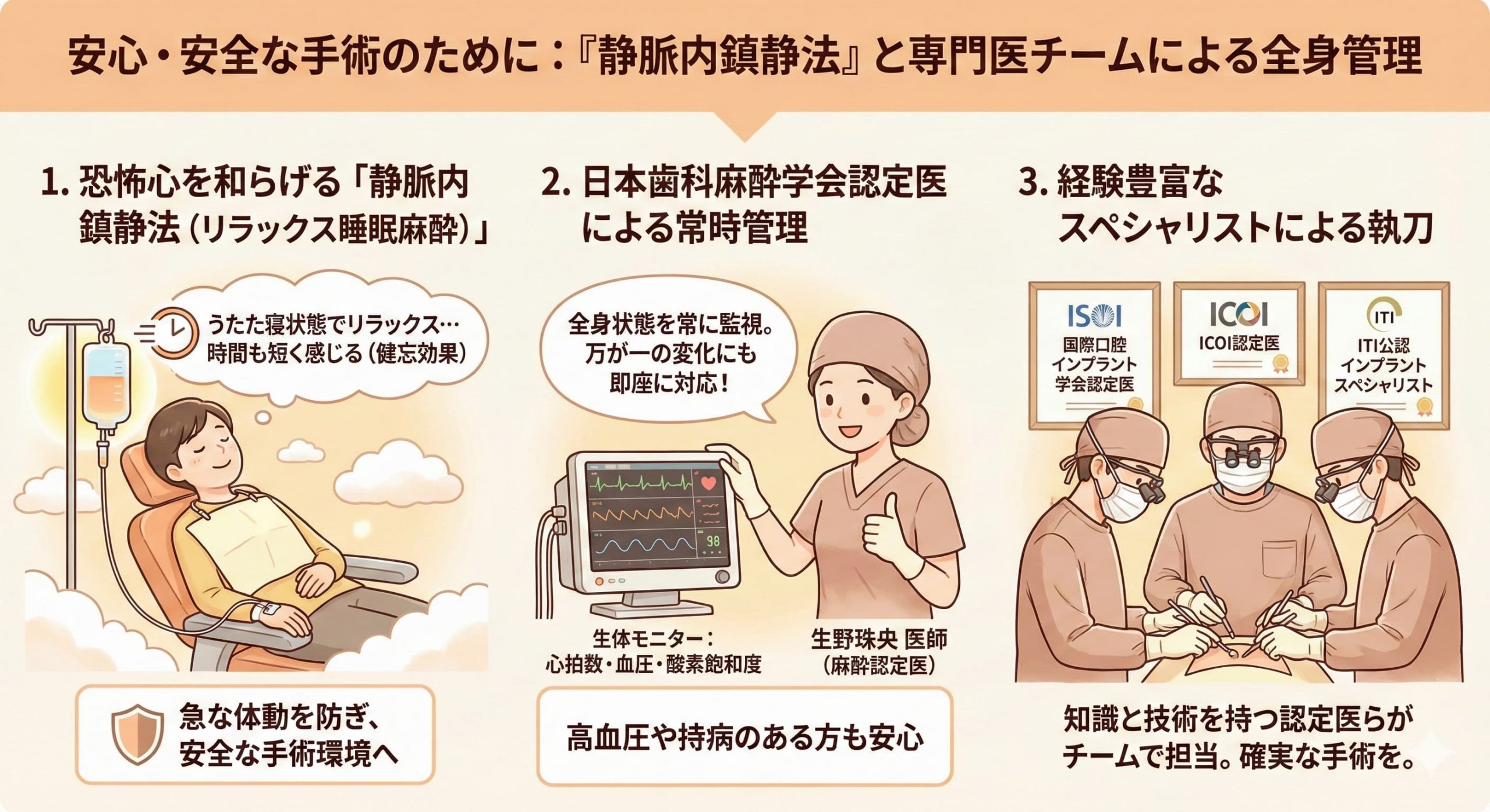 当院では、点滴から鎮静薬を静脈に投与し、半分眠ったような「うたた寝状態」を作る「静脈内鎮静法(リラックス睡眠麻酔)」を導入しています 。意識は完全にはなくなりませんが、恐怖心や不安感が薄れ、時間の経過も短く感じられます(健忘効果)。 これにより、恐怖で体が強張ったり、急に動いてしまったりすることを防ぎ、歯科医師が手術に集中できる環境を作ります。当院には女性の日本歯科麻酔学会認定医(生野珠央医師)が常駐しており、きめ細やかな管理を行っています 。