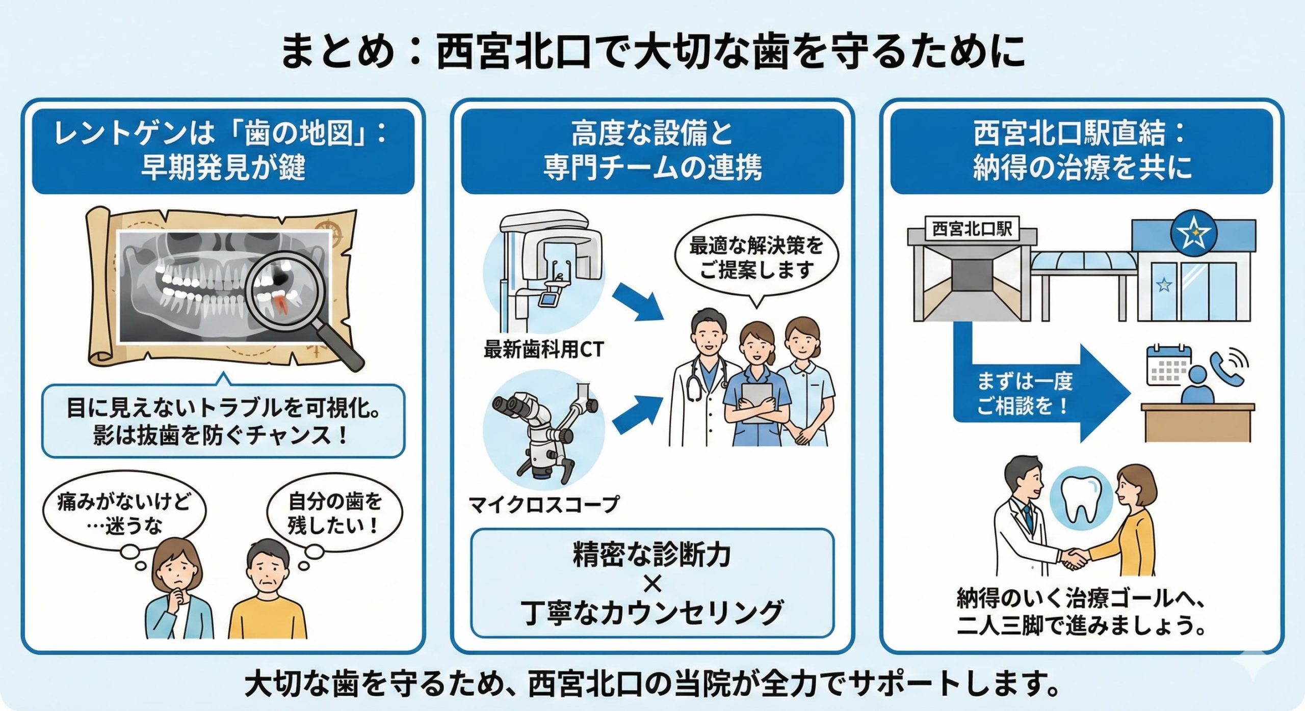 「レントゲンで影があると言われたけれど、痛みがないから迷っている」「自分の歯を可能な限り残したい」とお考えの方は、ぜひ一度、西宮北口駅直結の当院へご相談ください。精密な診断と丁寧なカウンセリングで、あなたの納得のいく治療を共に進めてまいりましょう。