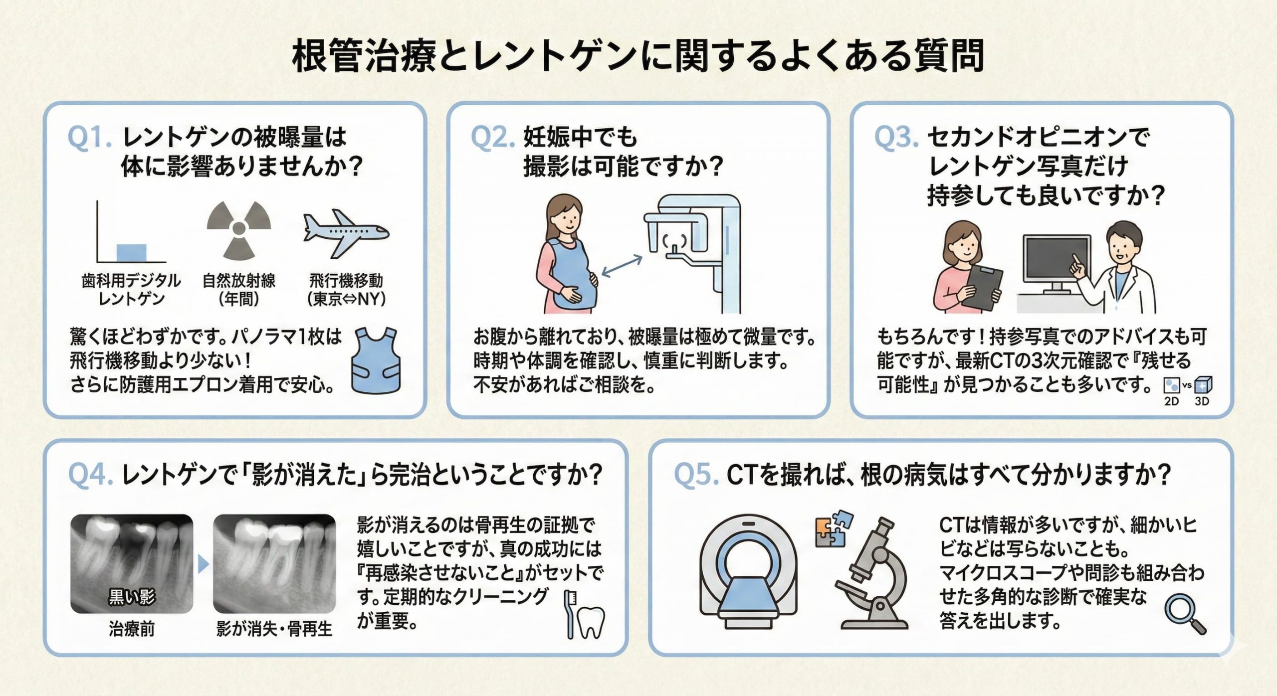 根管治療においてレントゲン写真は、目に見えないトラブルを可視化するための欠かせない「地図」のような存在です。もし「黒い影」が見つかったとしても、それは適切な治療を行うことで、将来の抜歯を防ぐためのチャンスでもあります。当院では最新の歯科用CTとマイクロスコープ、そして専門性の高い歯科医師とトリートメントコーディネーターが連携し、患者さまお一人おひとりに最適な解決策をご提案します。