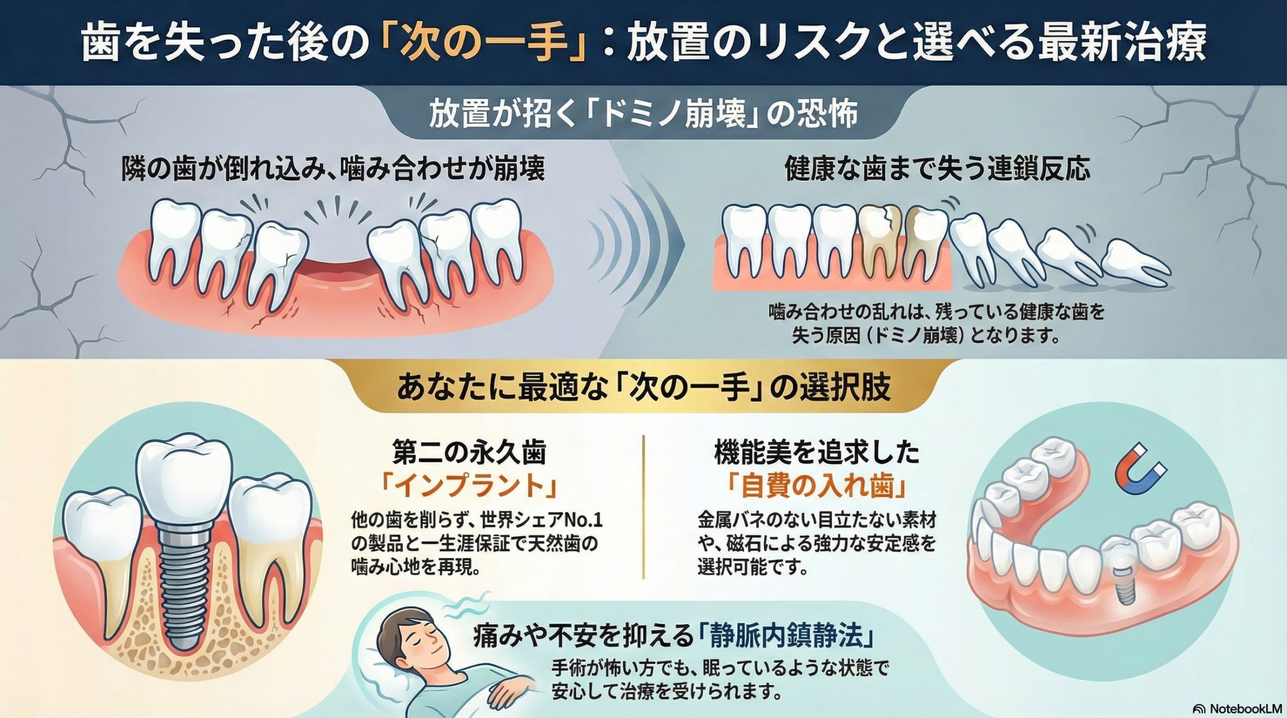 最善を尽くしても保存が難しい場合や、すでに抜歯を経験されている方もいらっしゃるでしょう。 一番やってはいけないのは、抜けたところを放置することです。空いたスペースに隣の歯が倒れ込み、噛み合わせのバランスが崩れると、健康だった他の歯まで連鎖的に失う「ドミノ崩壊」が始まってしまいます。