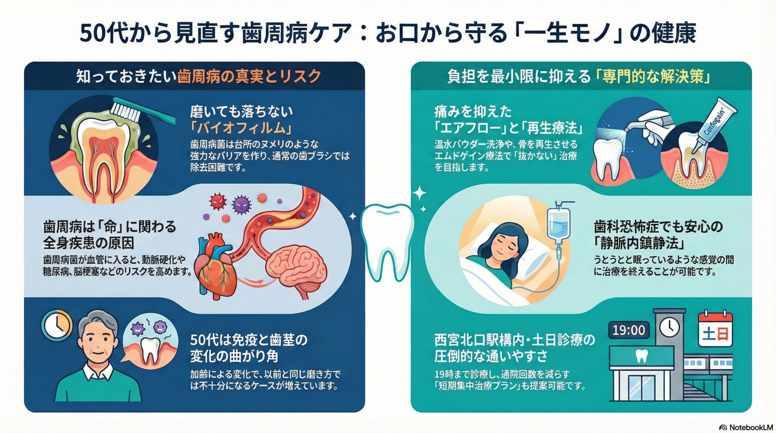 Q4:歯周病が全身の病気に関係するって本当ですか? 「生野院長:はい、これは決して脅かしではなく、科学的な事実なんです。歯周病菌が血管に入ると、動脈硬化を促進したり、糖尿病を悪化させたりします。特に50代からは、血圧や血糖値が気になり始める時期ですよね。お口を健康に保つことは、心筋梗塞や脳梗塞の予防にも直結します。歯を守ることは、あなたの『命』を守ることだと思って、大切にしていただきたいですね。」