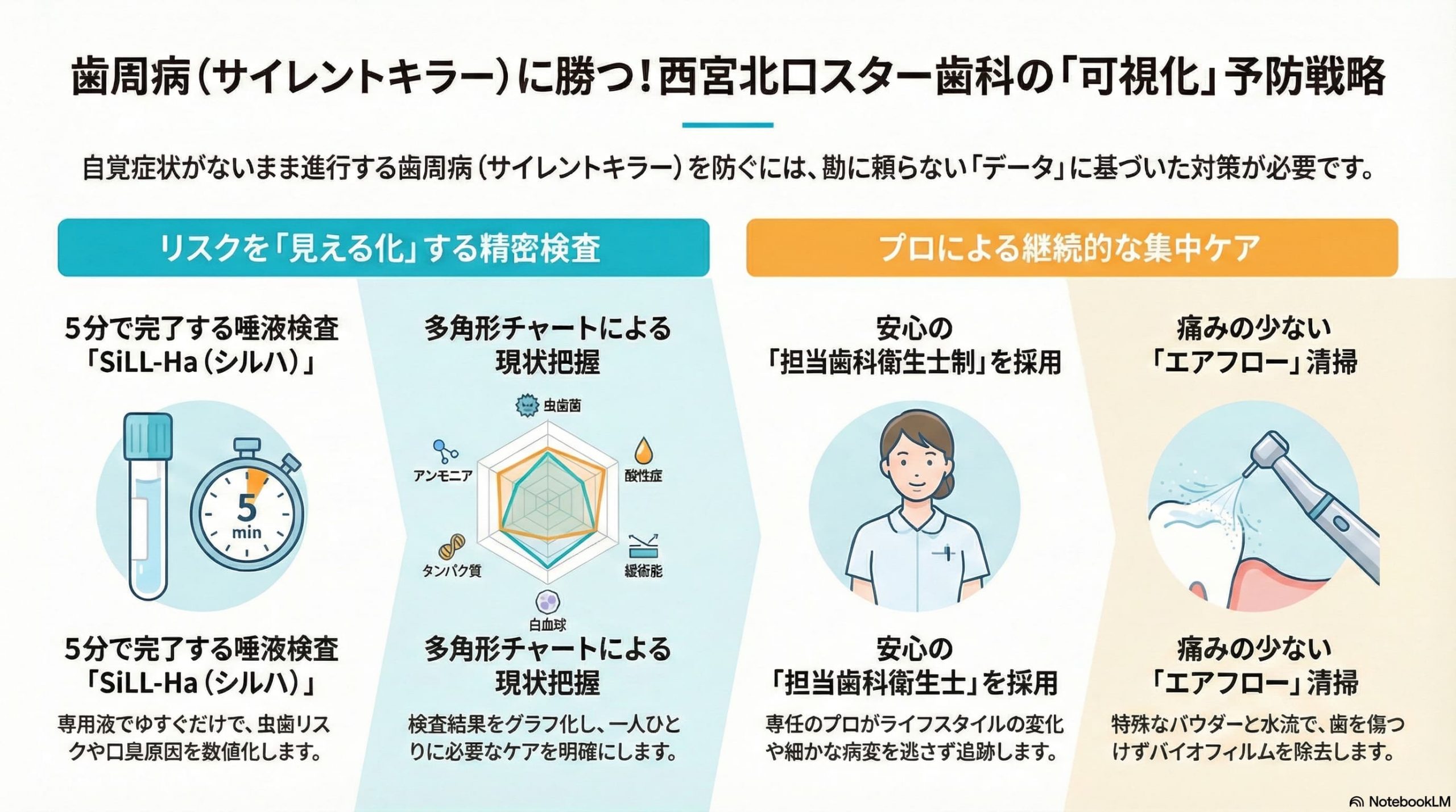 痛みがないまま進む敵に打ち勝つには、勘や経験に頼った治療ではなく、今の状態を正しく知る「データ」が必要です。 西宮北口スター歯科では、患者様がご自身の現状を客観的に把握し、納得感を持って予防に取り組めるよう、最新のデジタル機器を用いた「可視化」を徹底しています。