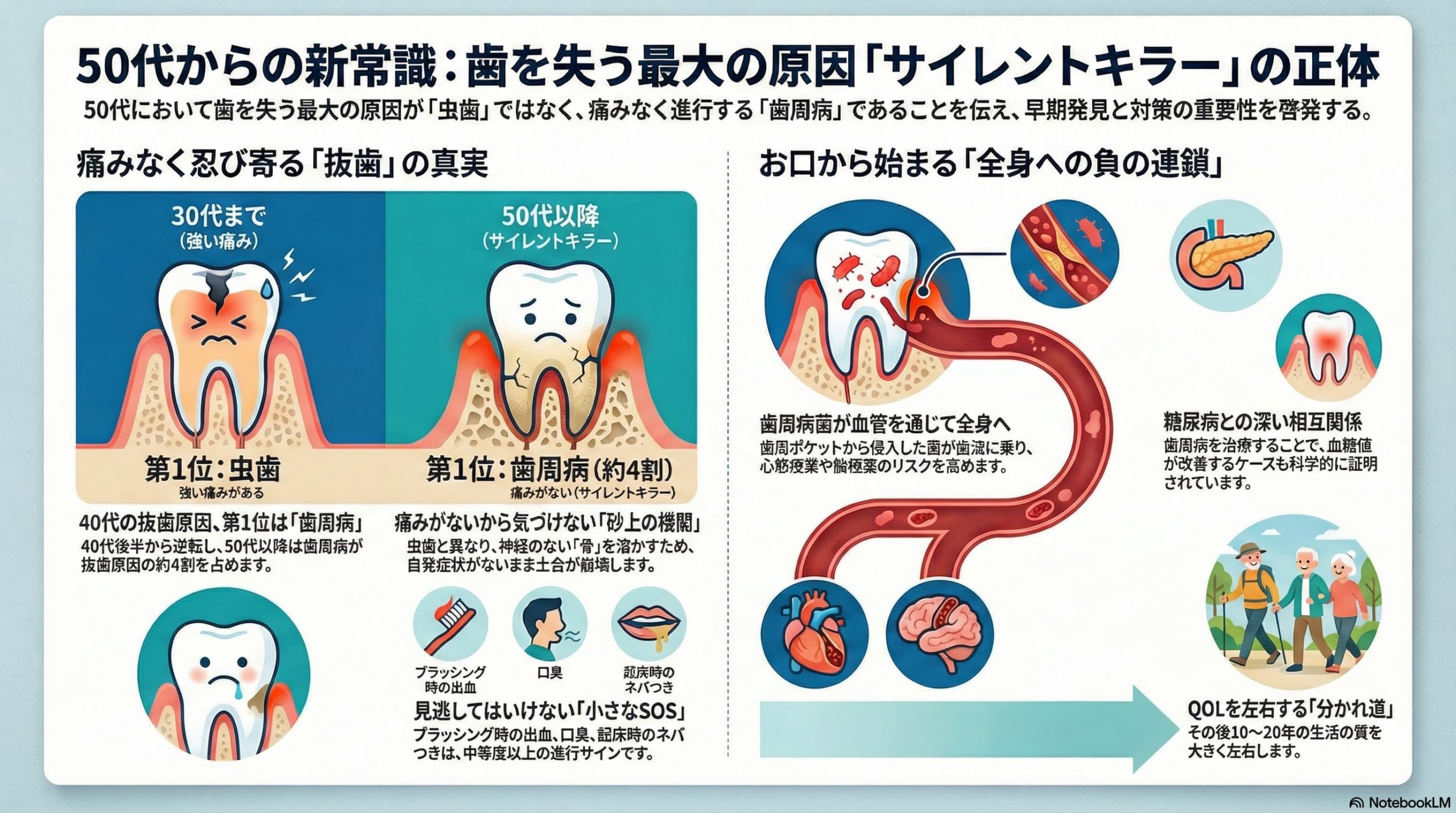 【50代の誤算】歯を失う原因のNo.1は虫歯ではない。静かに進行する「サイレントキラー」の正体