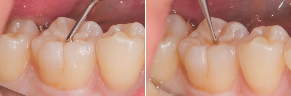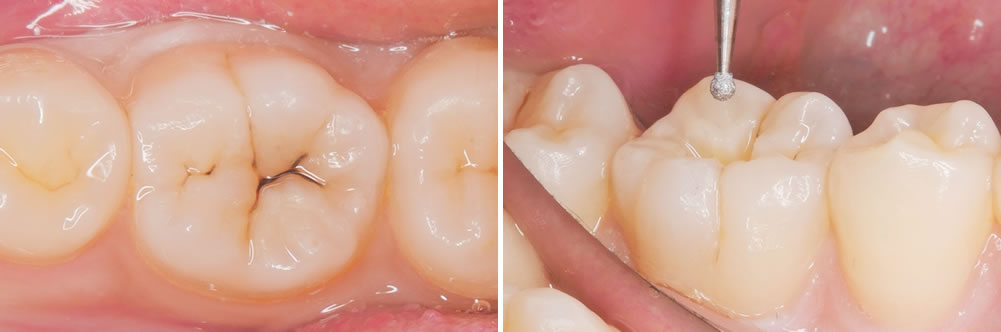右下の奥歯に黒い部分が見受けられます。範囲は小さいため、出来るだけ削らないように先端の小さな器具を用いて丁寧に虫歯を除去していきます。