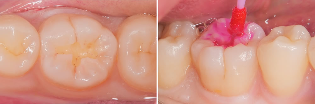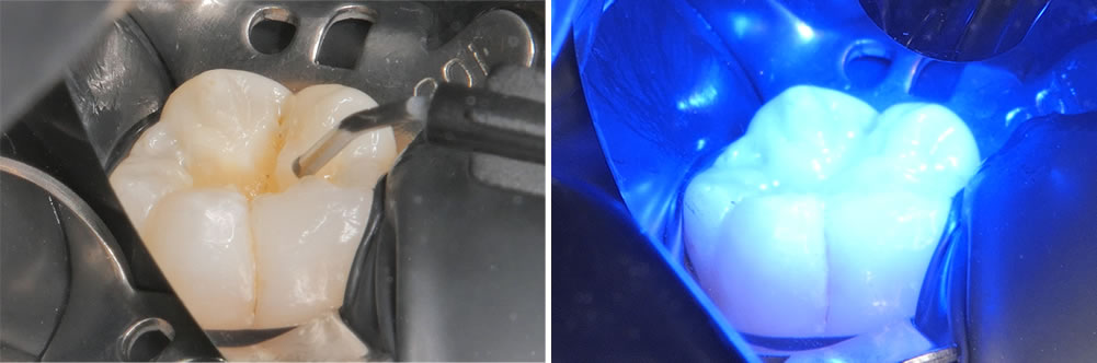 虫歯治療の際は、う蝕検知液を使用して虫歯菌に感染した歯質を染め出します。健康な歯質と虫歯部分の境目が視認しやすくなるため、より精密な切削が可能となります。
