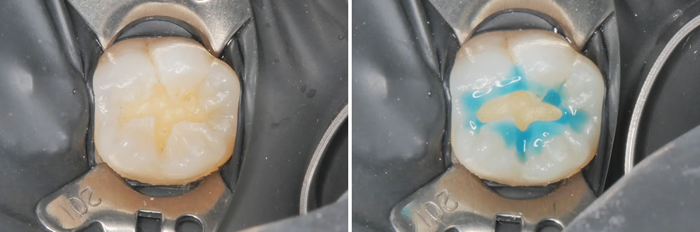 う蝕検知液を用いて丁寧に虫歯を取り除いていきます。