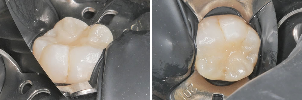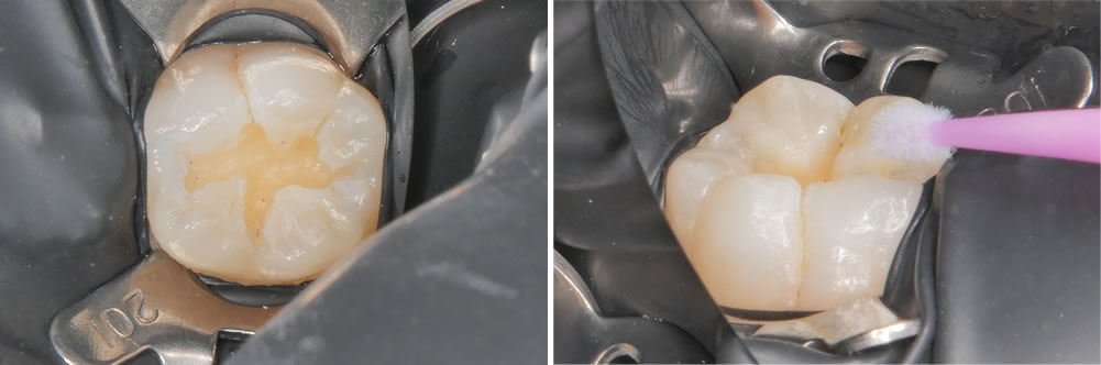 内部の虫歯を取り除いた状態です。接着力を上げるため酸処理を行いました。