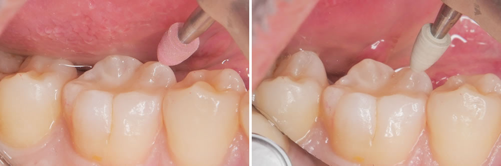 虫歯治療で歯を削った部分は、できるだけダイレクトボンディング(CR充填)による修復を心がけております。ダイレクトボンディングは、歯を削った部分に歯科用の樹脂を流し込んで、その場で形態を整える修復法です。歯の切削範囲を最小限に抑えられるだけでなく、型取りなどの工程がないため、即日で治療が完了します。