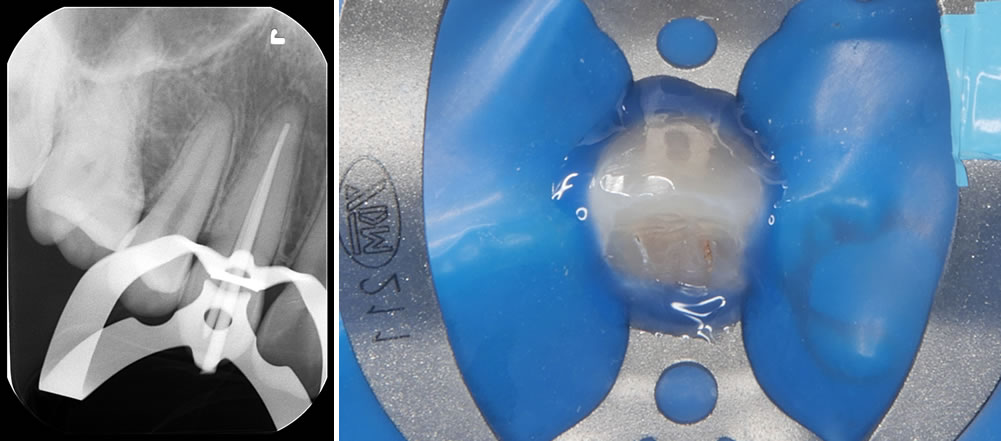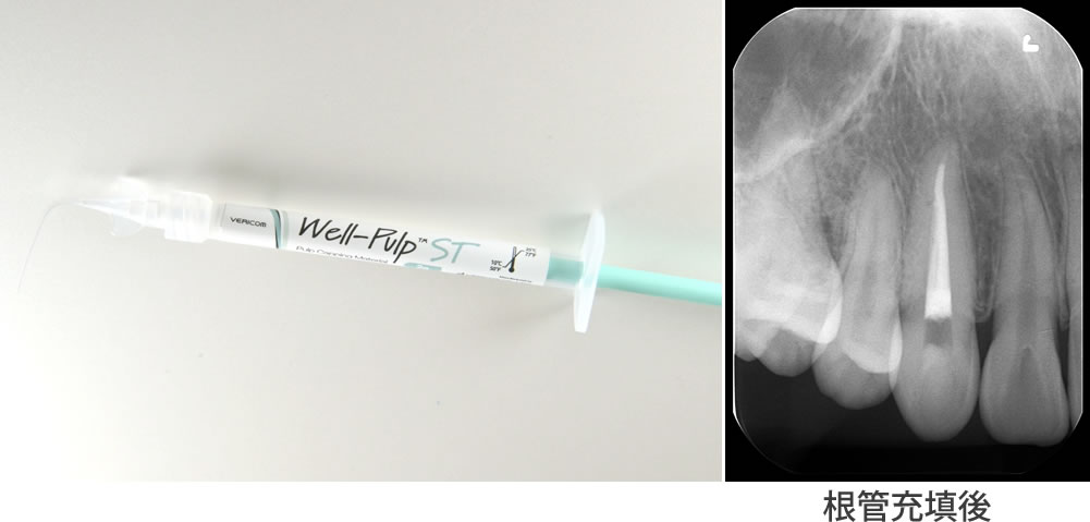 さらに、根管の充填にはバイオセラミックシーラーという先進の材料を使用しました。このシーラーは封鎖性が非常に高く、再感染を起こしにくい特長があり、長期的な予後に優れています。患者さんは20代と若く、今後長くご自身の歯を守っていく必要があります。