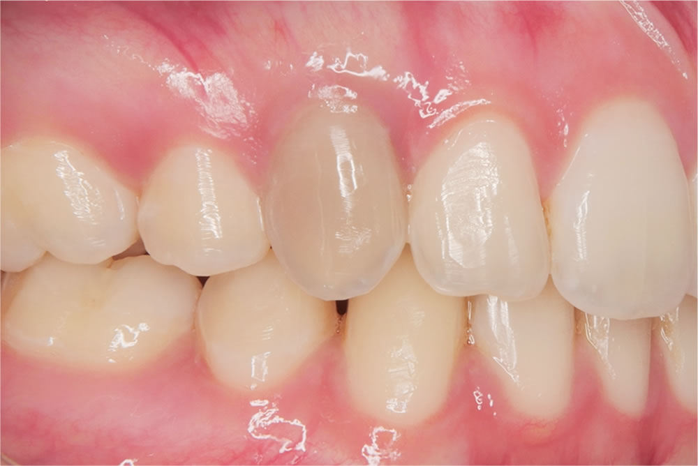 神経を失い黒ずんだ前歯を削らずに耐久性と審美性を回復した症例