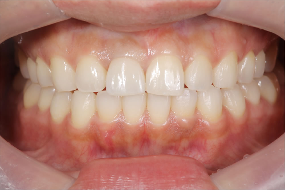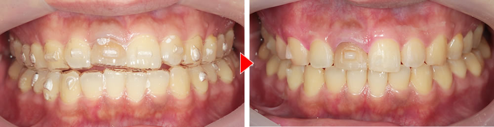 約半年間、マウスピース矯正装置(インビザライン)で全体のバランスを丁寧に整え、「前歯を美しく入れるための土台作り」を行いました。