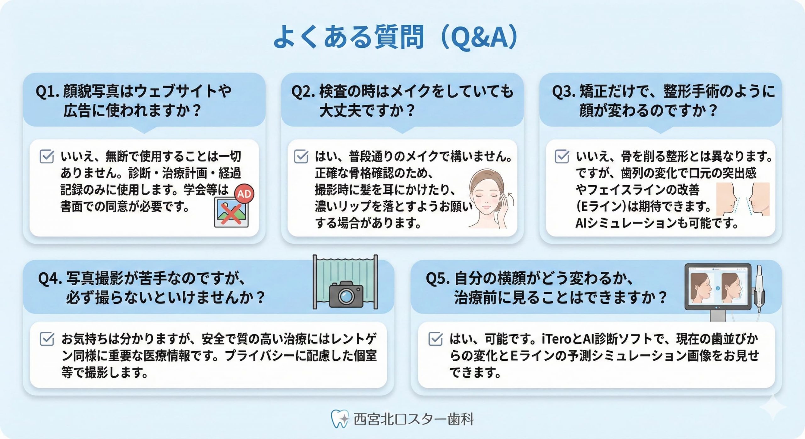 Q1. 顔貌写真はウェブサイトや広告に使われますか? いいえ、無断で使用することは一切ありません。撮影した写真は、あくまで診断と治療計画の立案、および治療経過の記録(ビフォーアフターの確認)のために使用します。学会発表やモニターとして使用する場合は、必ず事前に書面での同意をいただきますのでご安心ください