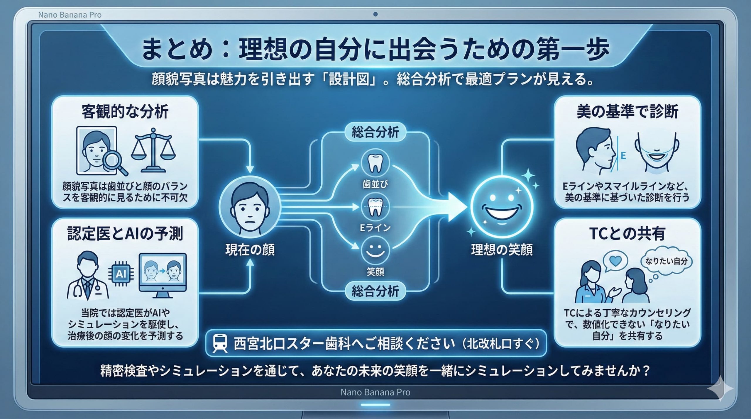 矯正治療における「顔貌写真」は、あなたの魅力を最大限に引き出すための「設計図」を描くために欠かせないものです。 顔全体のバランス、横顔のEライン、そして笑顔の輝き。これらを総合的に分析することで、初めてあなたに最適な治療プランが見えてきます。