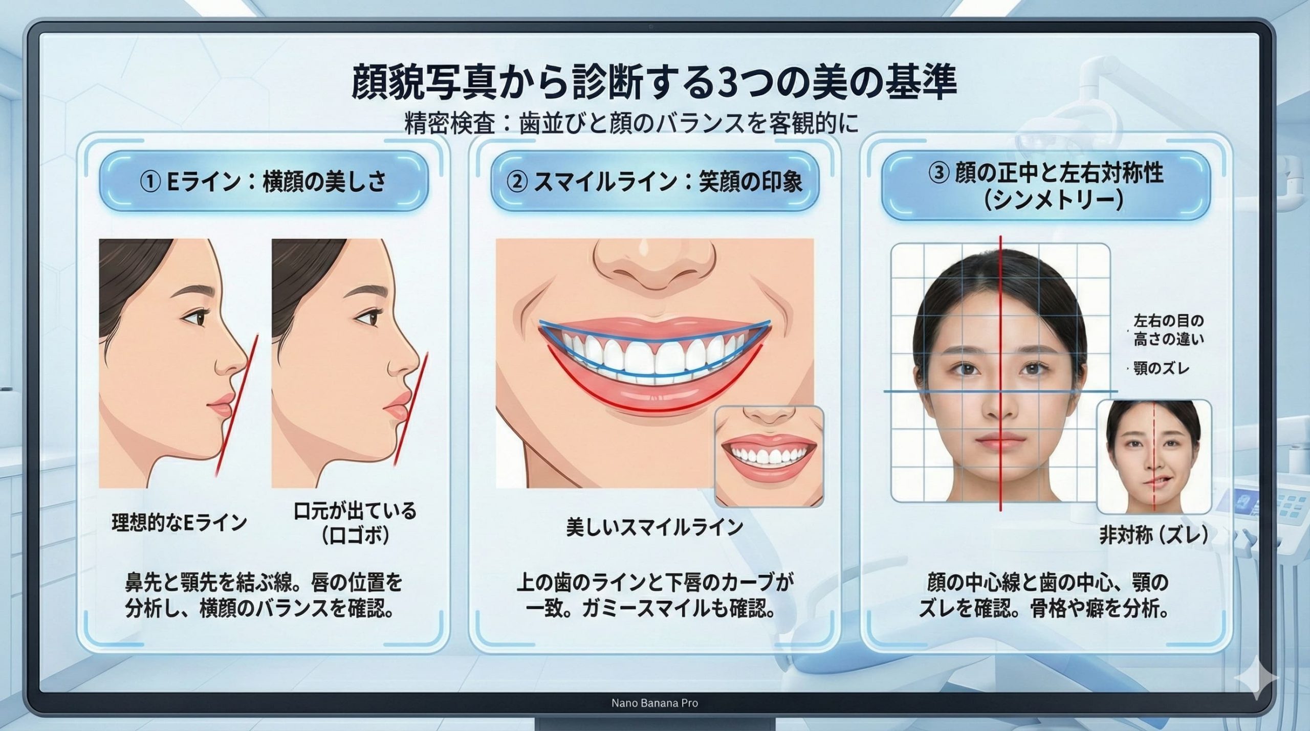 Eラインやスマイルラインなど、美の基準に基づいた診断を行う
