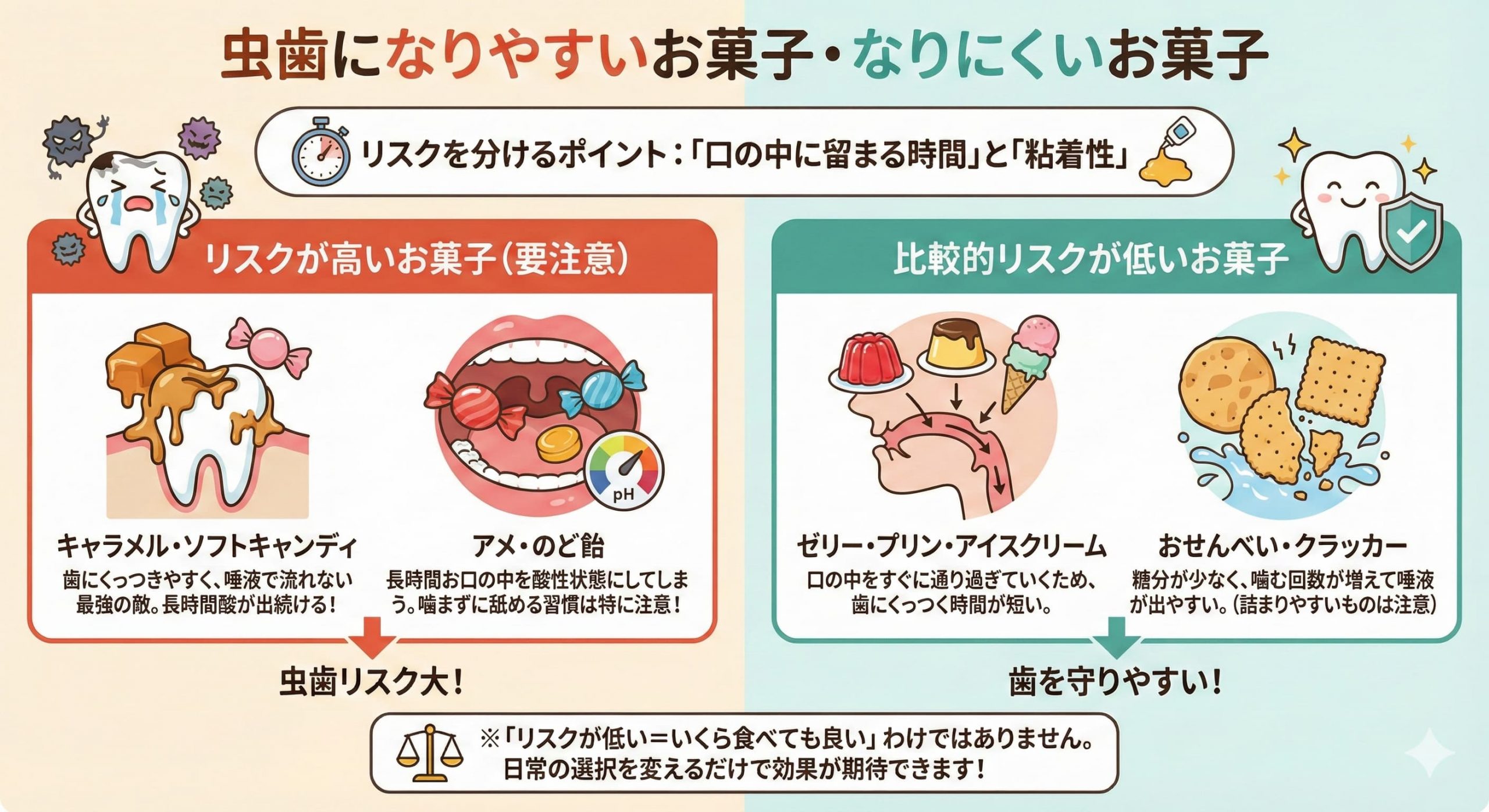 すべてのお菓子が同じように悪いわけではありません。虫歯リスクを分けるポイントは、「糖分の量」だけでなく「口の中に留まる時間」と「粘着性」にあります。