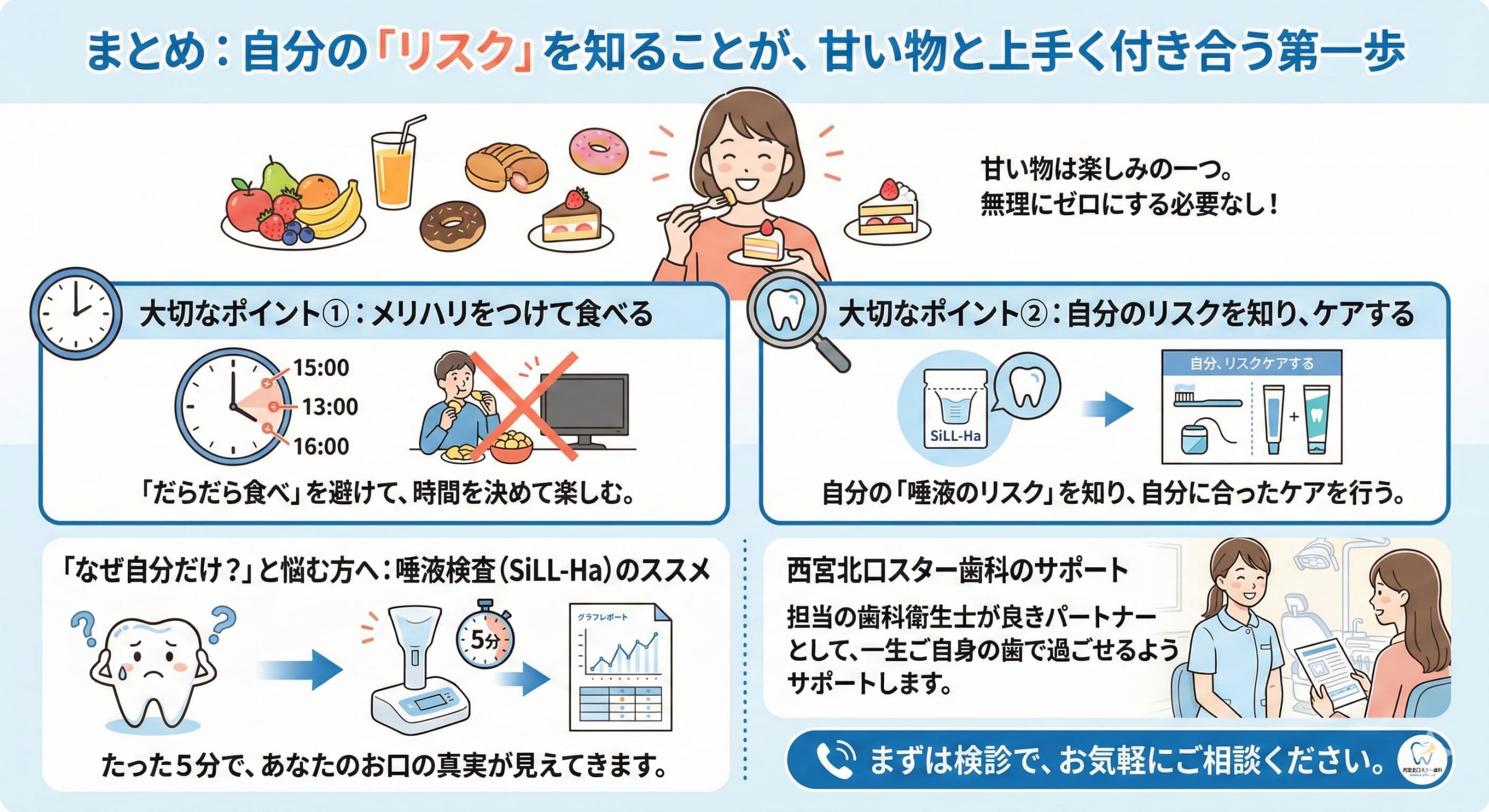 やみくもに「甘い物を我慢する」のではなく、自分の弱点を知って効率的に守る。これが当院が提案する予防歯科です。