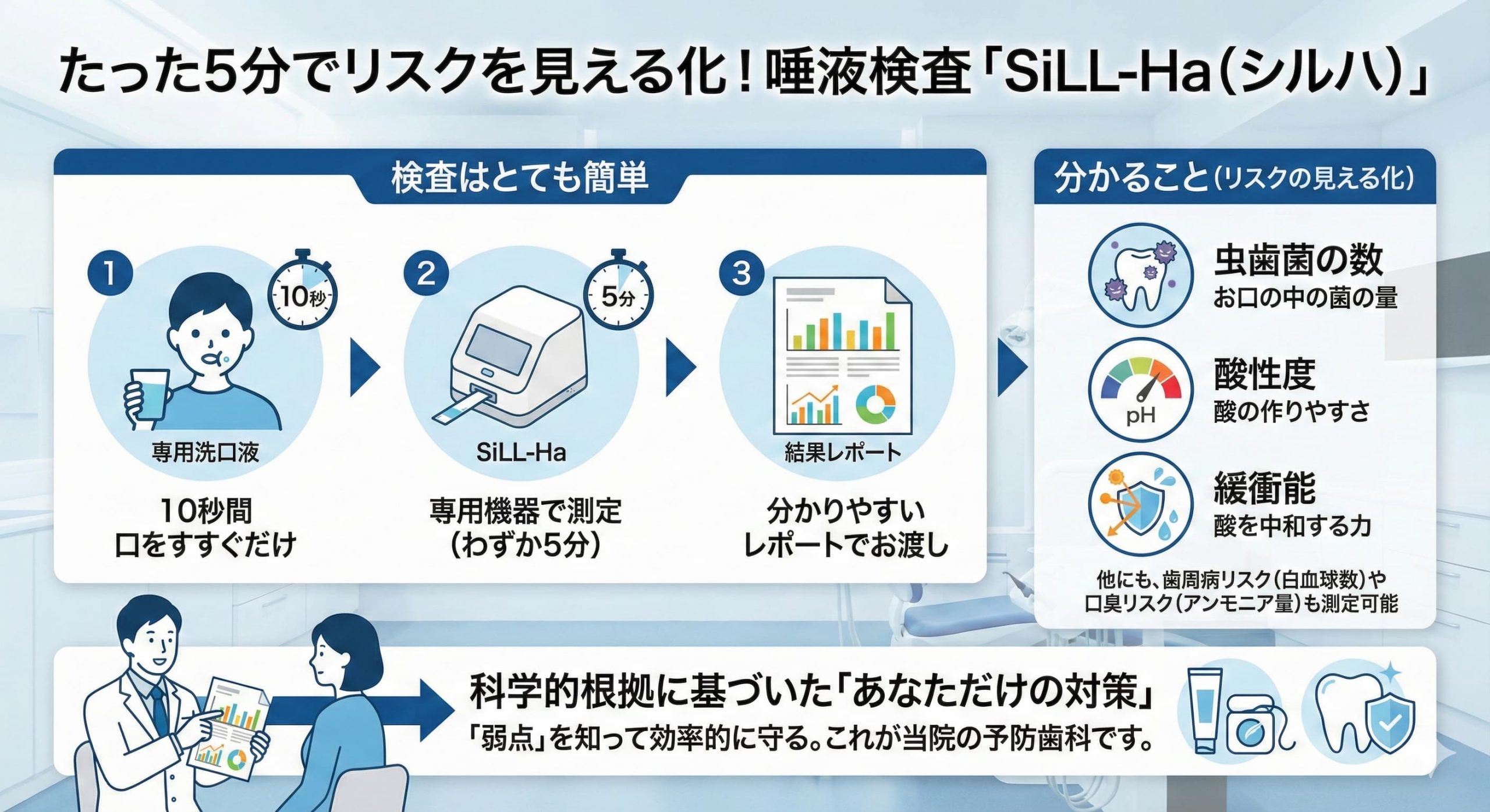 「なぜ自分だけ虫歯になるのか?」と悩んでいる方は、一度当院で唾液検査(SiLL-Ha)を受けてみませんか? たった5分で、あなたのお口の真実が見えてきます。