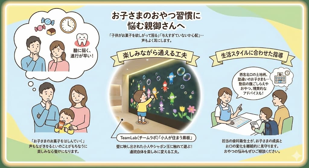 また、西宮北口という土地柄、塾に通っているお子さまも多くいらっしゃいます 。塾に行く前の腹ごしらえやおやつをどうするかなど、ライフスタイルに合わせた現実的なアドバイスも行っています。 担当の歯科衛生士が、お子さまの成長とお口の変化を継続的に見守りますので、おやつの悩みもぜひご相談ください 。