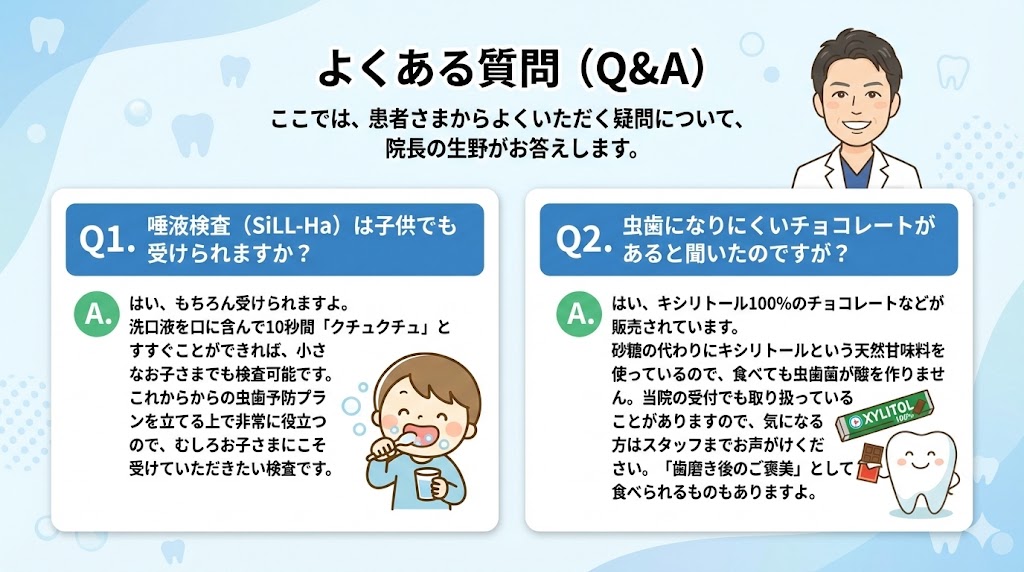 Q1. 唾液検査(SiLL-Ha)は子供でも受けられますか? A. はい、もちろん受けられますよ。 洗口液を口に含んで10秒間「クチュクチュ」とすすぐことができれば、小さなお子さまでも検査可能です。これからの虫歯予防プランを立てる上で非常に役立つので、むしろお子さまにこそ受けていただきたい検査です。