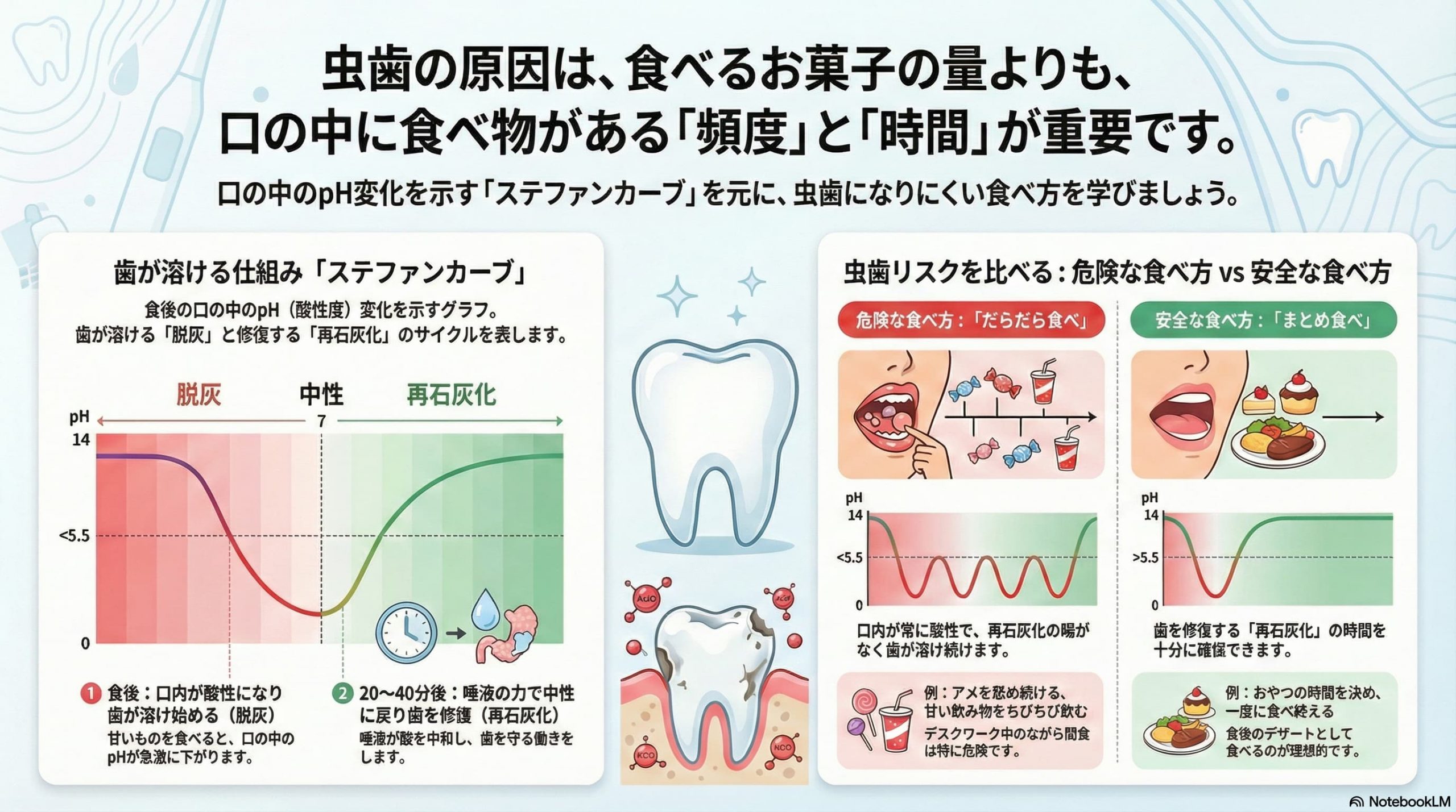 通常、口の中は中性(pH7付近)に保たれていますが、甘い物を食べて数分後には急激に酸性に傾き、歯が溶け始めます(脱灰)。その後、唾液の働きによって20分〜40分ほどかけてゆっくりと中性に戻っていきます(再石灰化)。