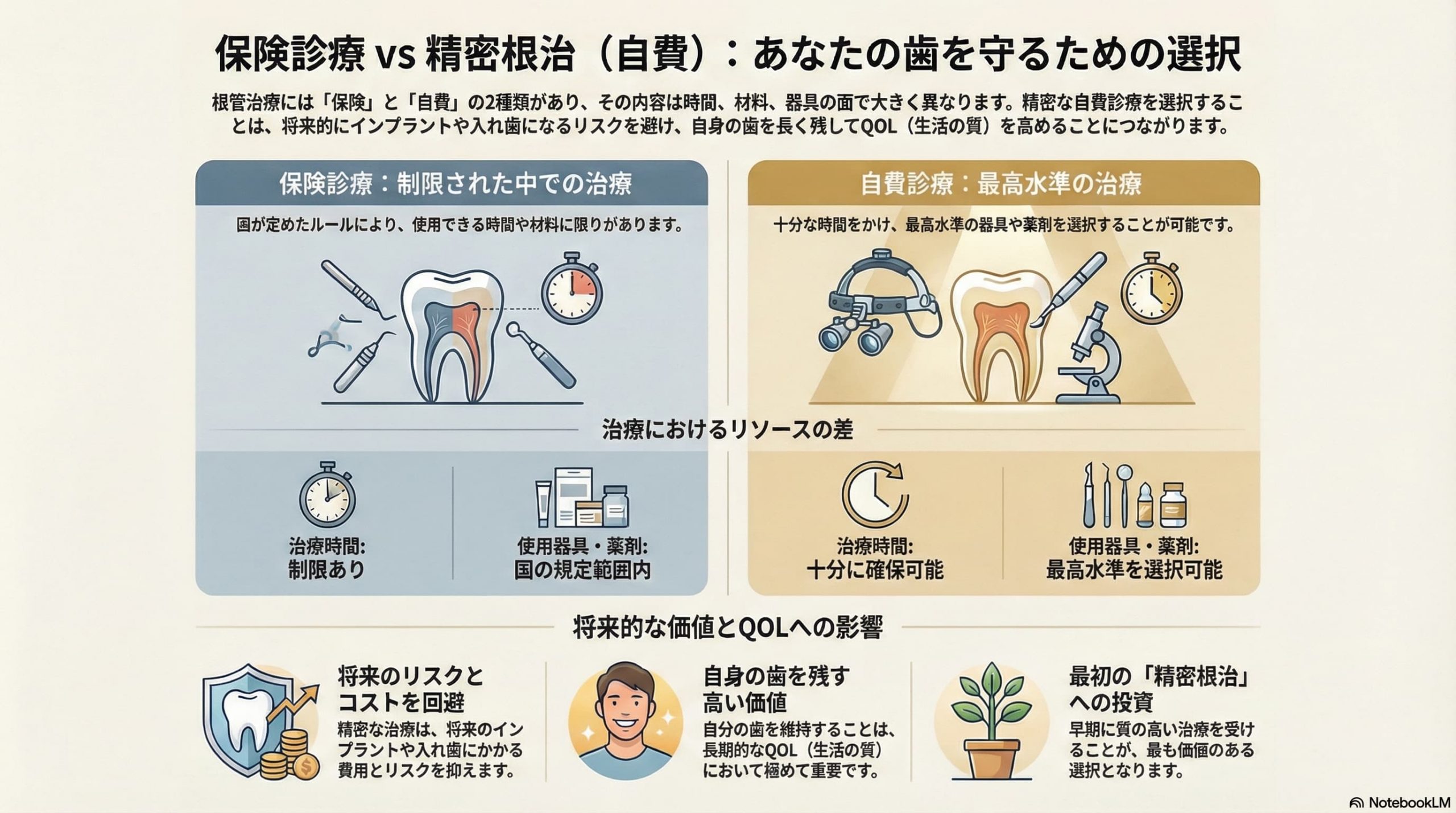 特に、将来的に歯を失ってインプラントや入れ歯を検討することになるリスクとコストを考えれば、最初の「精密根治」に投資してご自身の歯を残すことは、長期的なQOL(生活の質)において極めて高い価値があります。