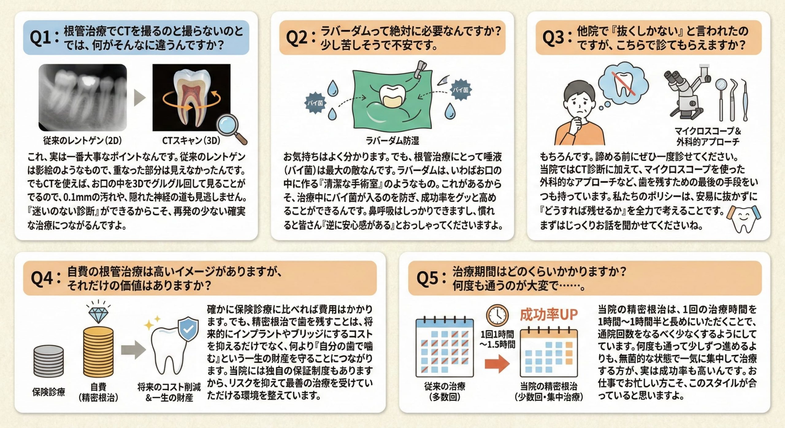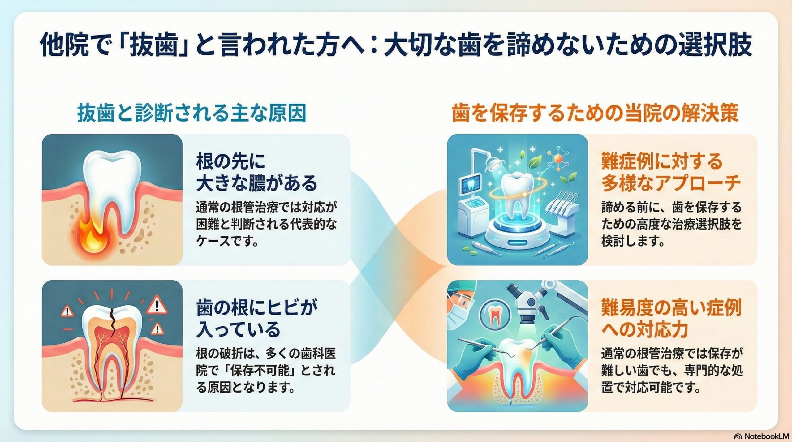 「もちろんです。諦める前にぜひ一度診せてください。当院ではCT診断に加えて、マイクロスコープを使った外科的なアプローチなど、歯を残すための最後の手段をいくつも持っています。私たちのポリシーは、安易に抜かずに『どうすれば残せるか』を全力で考えることです。まずはじっくりお話を聞かせてくださいね。」