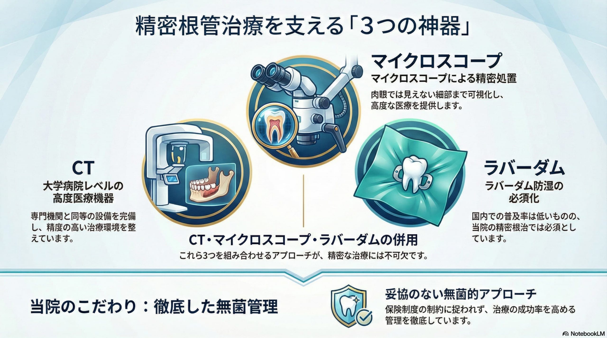 精密な根管治療(精密根治)を実現するためには、歯科用CTに加えて「マイクロスコープ」と「ラバーダム」を組み合わせた、いわゆる「3つの神器」によるアプローチが不可欠です。西宮北口スター歯科では、大学病院レベルの高度医療機器を完備し、これらを駆使した精密な治療を提供しています。