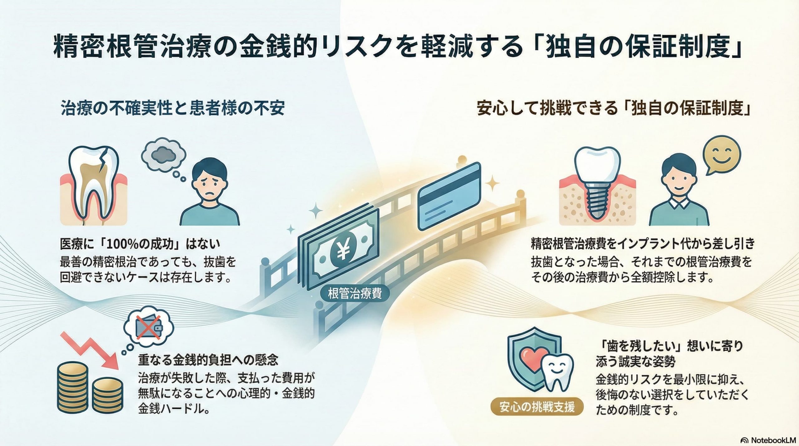 「確かに保険診療に比べれば費用はかかります。でも、精密根治で歯を残すことは、将来的にインプラントやブリッジにするコストを抑えるだけでなく、何より『自分の歯で噛む』という一生の財産を守ることにつながります。当院には独自の保証制度もありますから、リスクを抑えて最善の治療を受けていただける環境を整えています。」