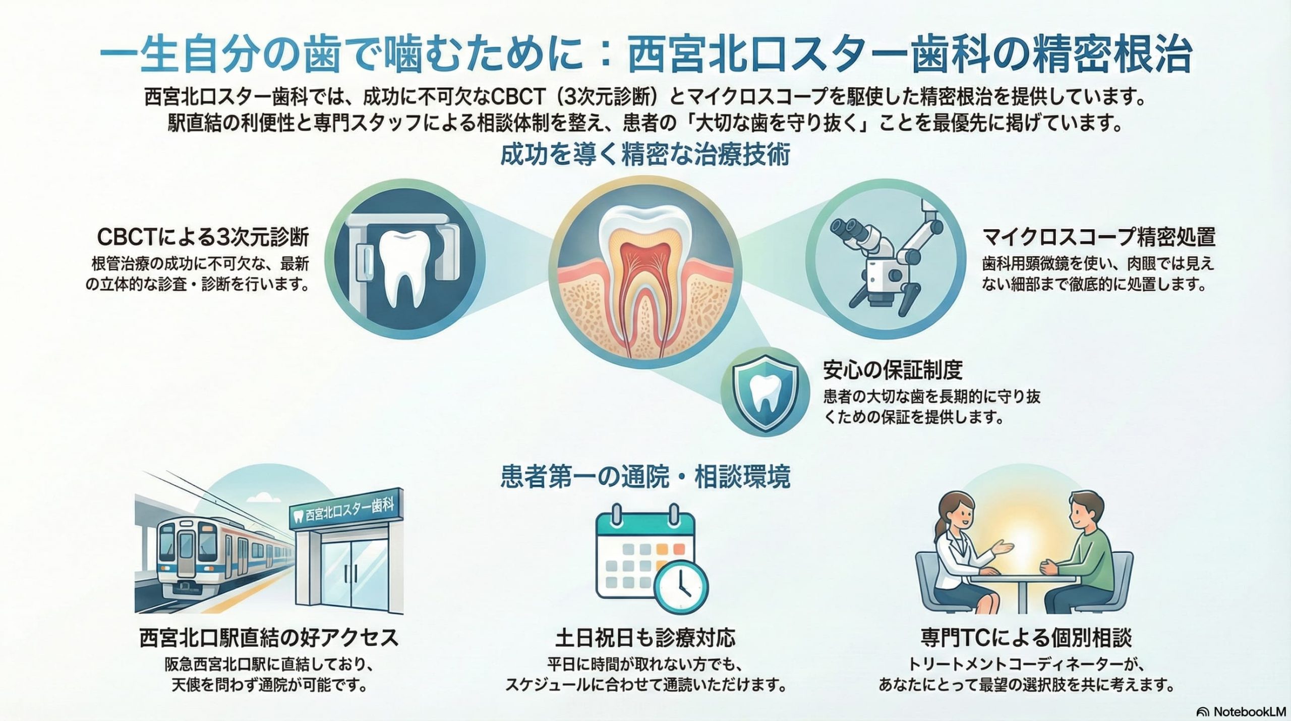 精密根治におけるCBCTの活用は、もはや「あれば良いもの」ではなく、成功のために「不可欠なもの」です。西宮北口スター歯科では、最新の3次元診断、マイクロスコープによる精密処置、そして患者さまの安心を支える保証制度を組み合わせることで、一人ひとりの大切な歯を守り抜くことに全力を尽くしています。