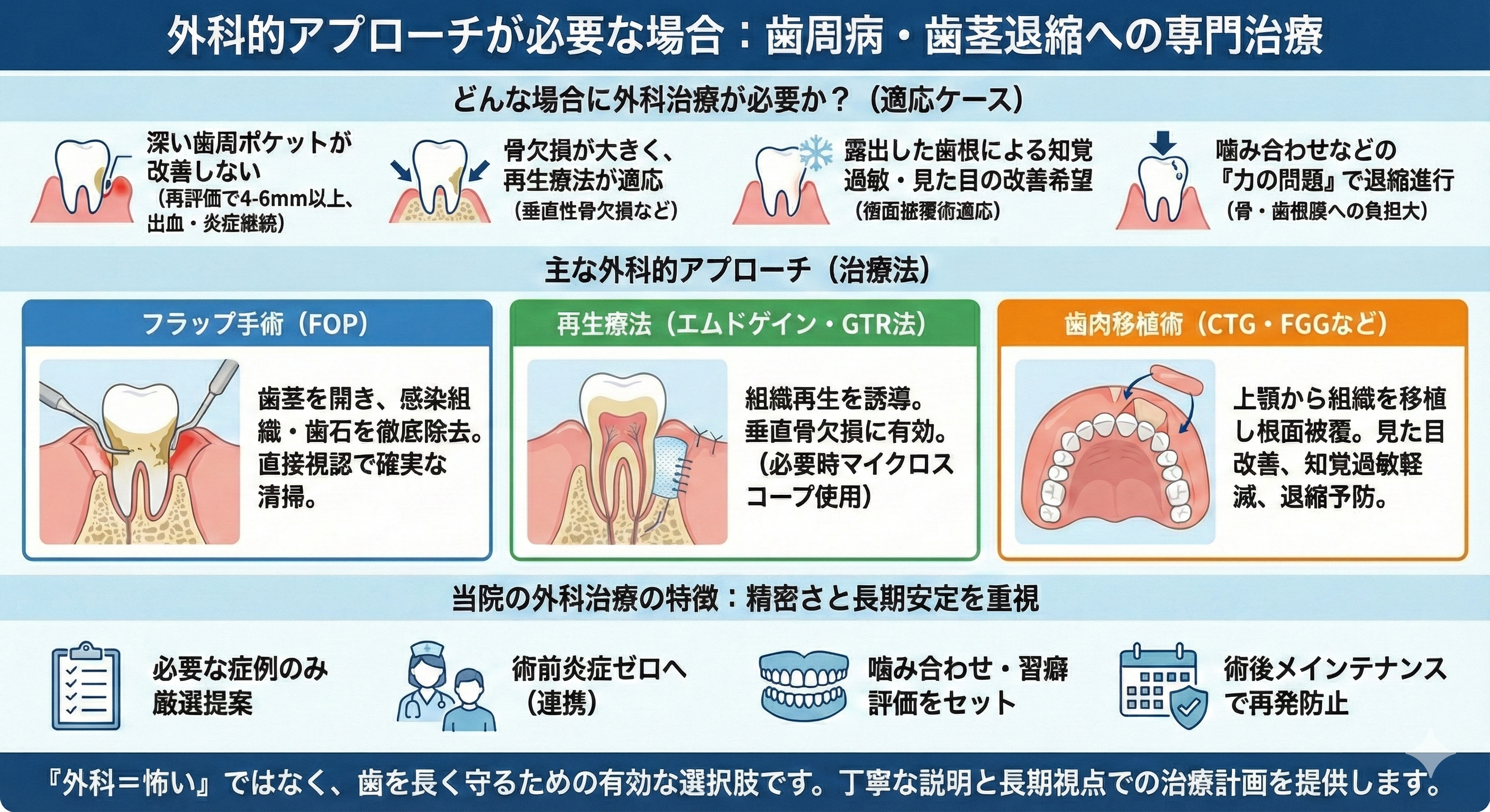 外科は「最後の手段」というイメージがありますが、適切な症例では大きな改善が期待でき、歯を長期的に守るための有効な選択肢となります。