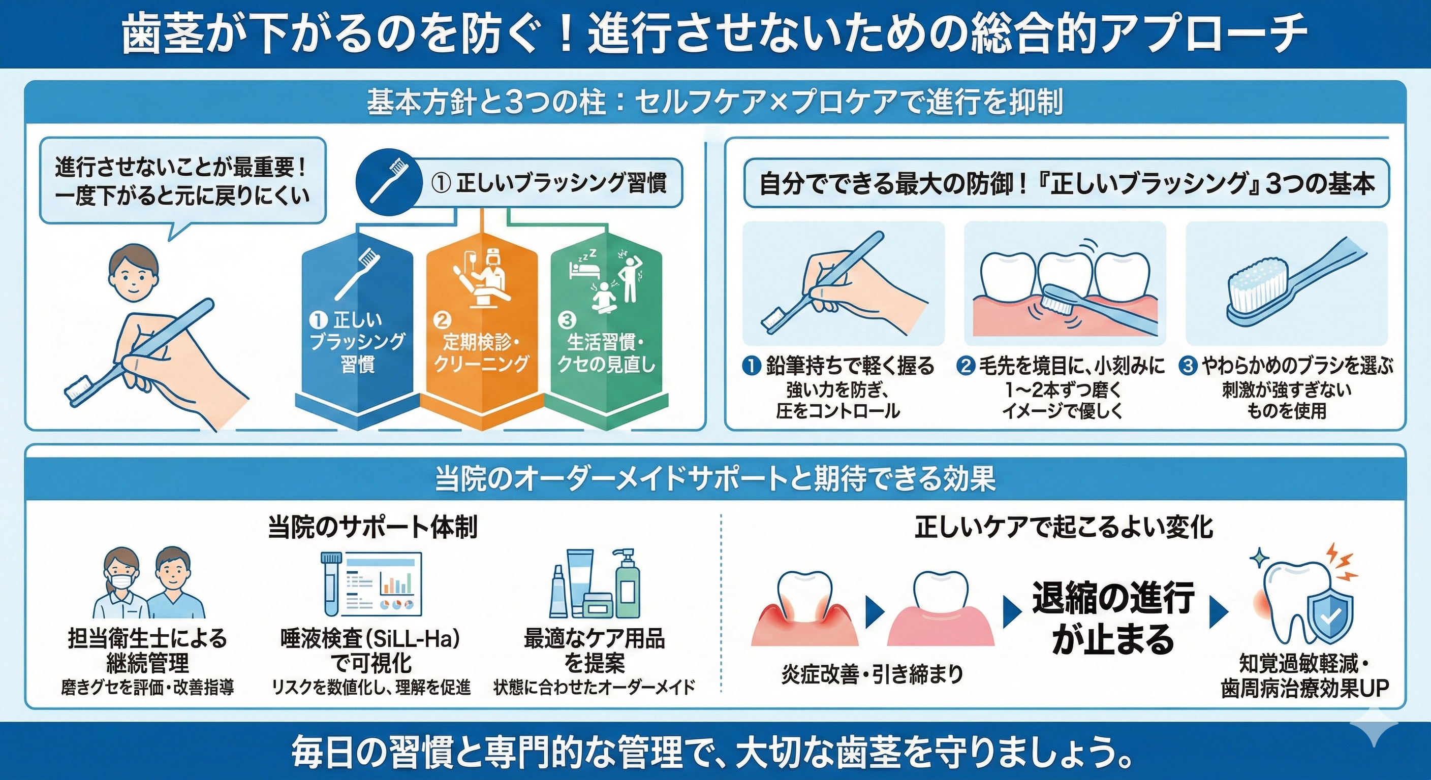 「歯茎が下がってきた気がする」「最近しみる」「見た目が気になる」など、どんな些細なことでも早めの対処が大切です。