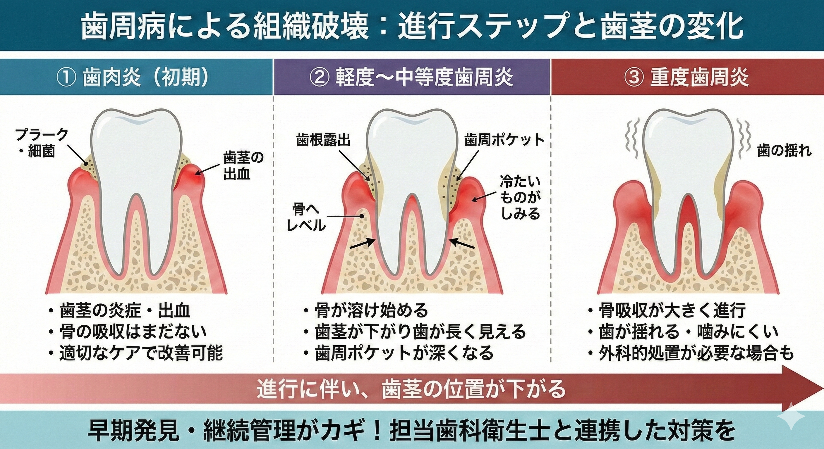 また、歯周ポケットが深くなることで細菌がさらに溜まりやすくなり、炎症と破壊が加速する悪循環に陥ります。