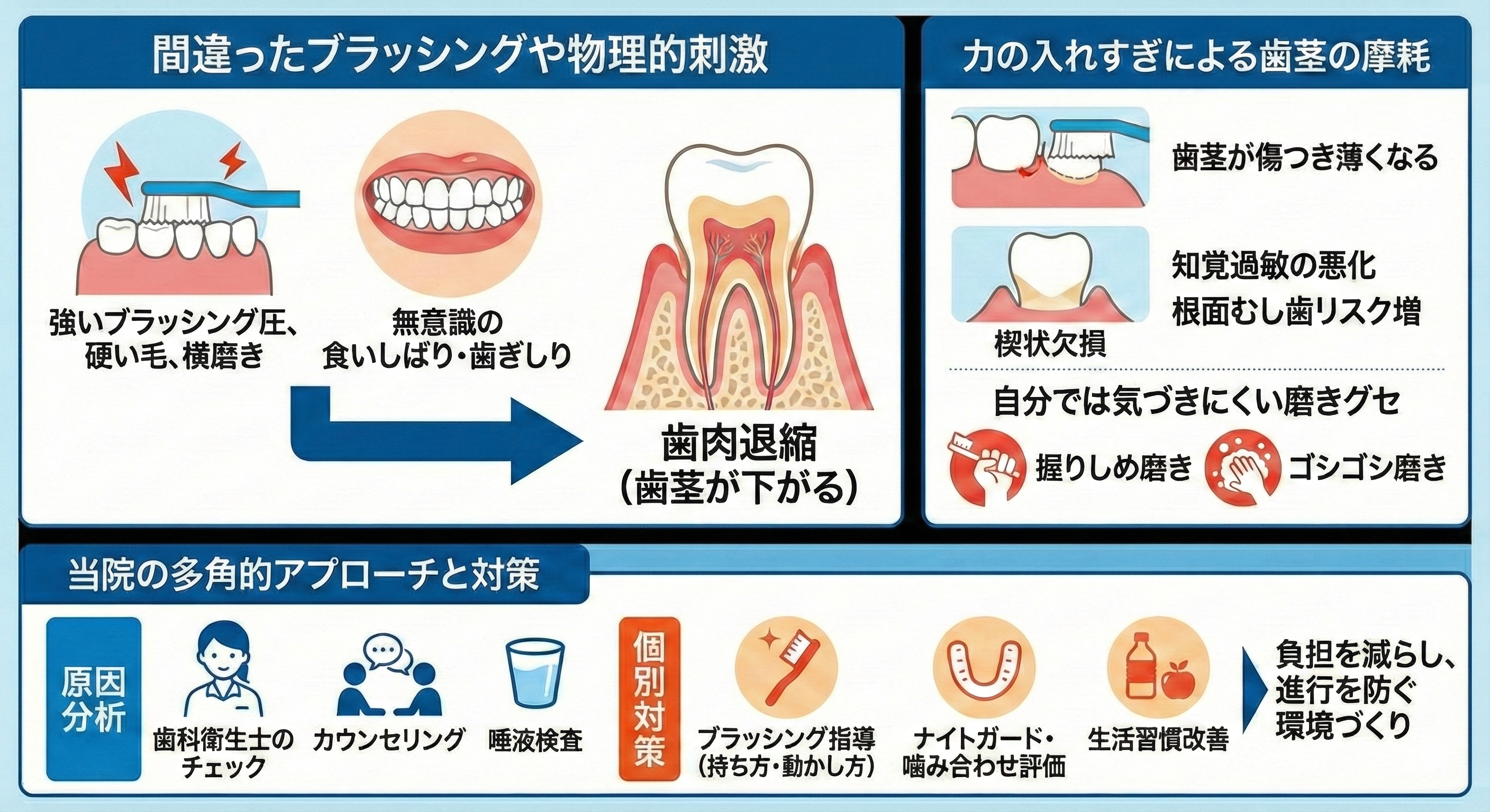 歯周病、間違ったブラッシング、噛み合わせや歯ぎしり、生活習慣、加齢による変化など、人によって組み合わせはさまざまです。だからこそ、「なぜ自分の歯茎が下がったのか」を正確に理解することが、治療と予防の第一歩になります。