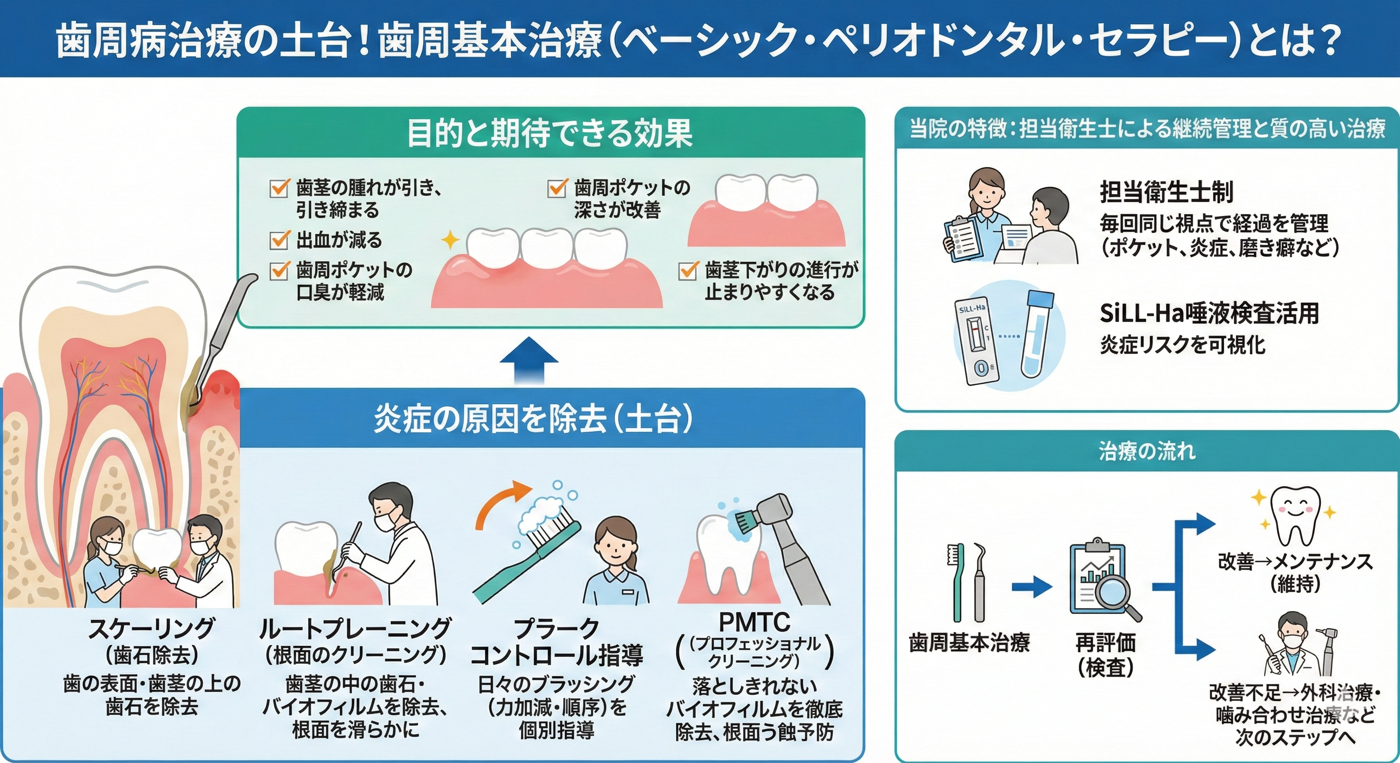 歯周病治療の成功は、この「基本治療 → 再評価 → 必要に応じた追加治療」の流れがどれだけ適切に行われるかで決まります。
