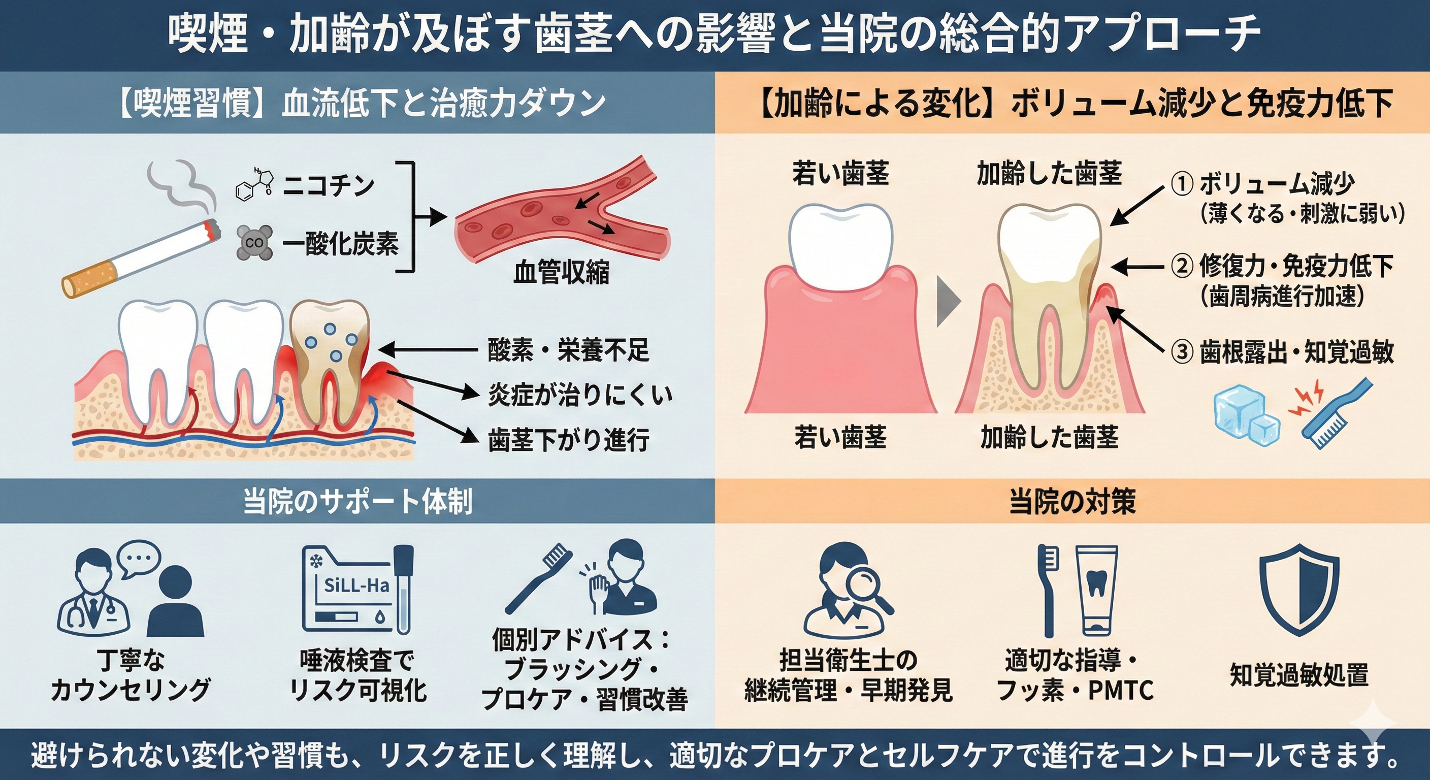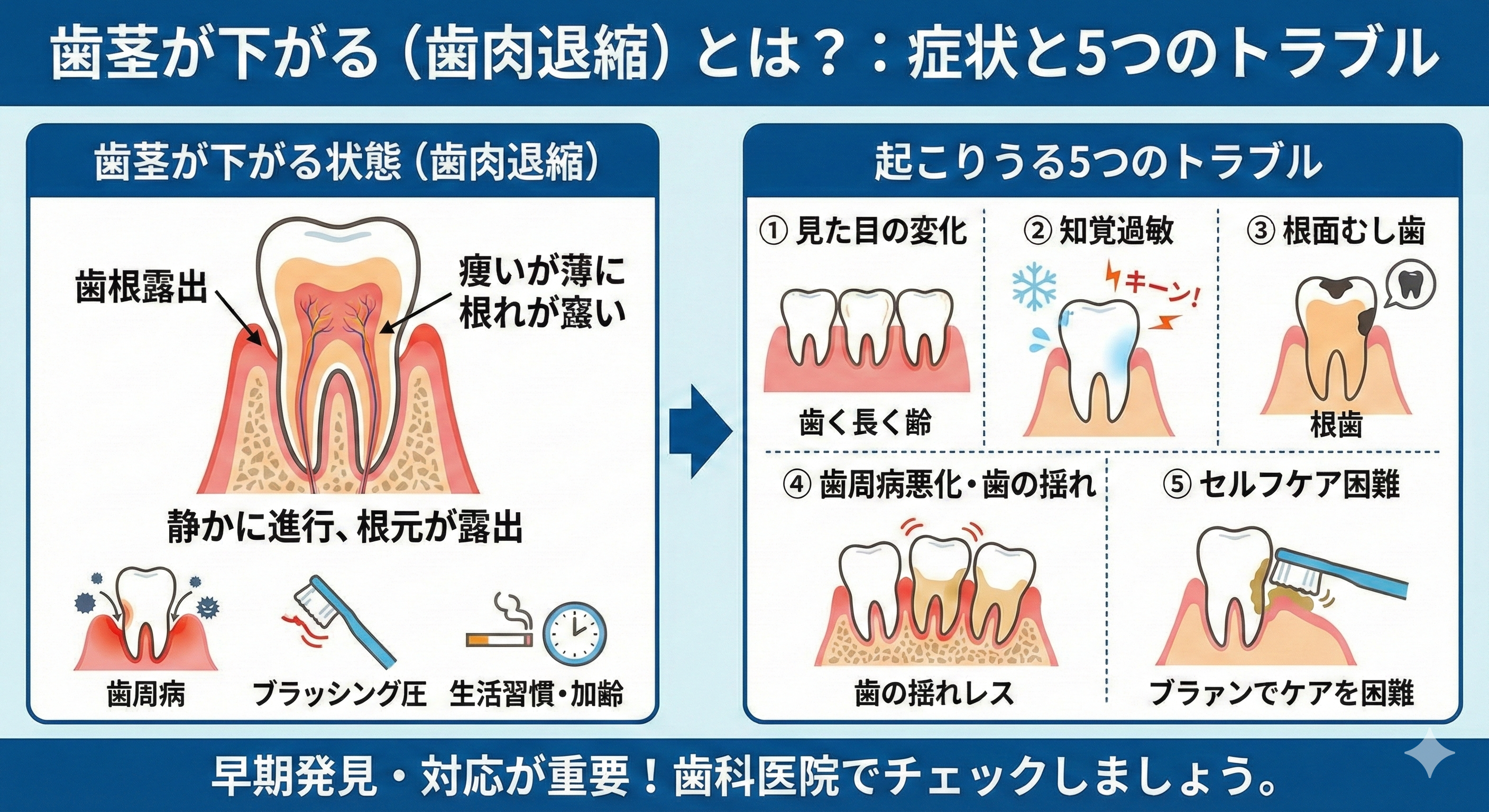まとめ:歯茎が下がる原因はひとつではなく、複数の要因が積み重なって進行します。