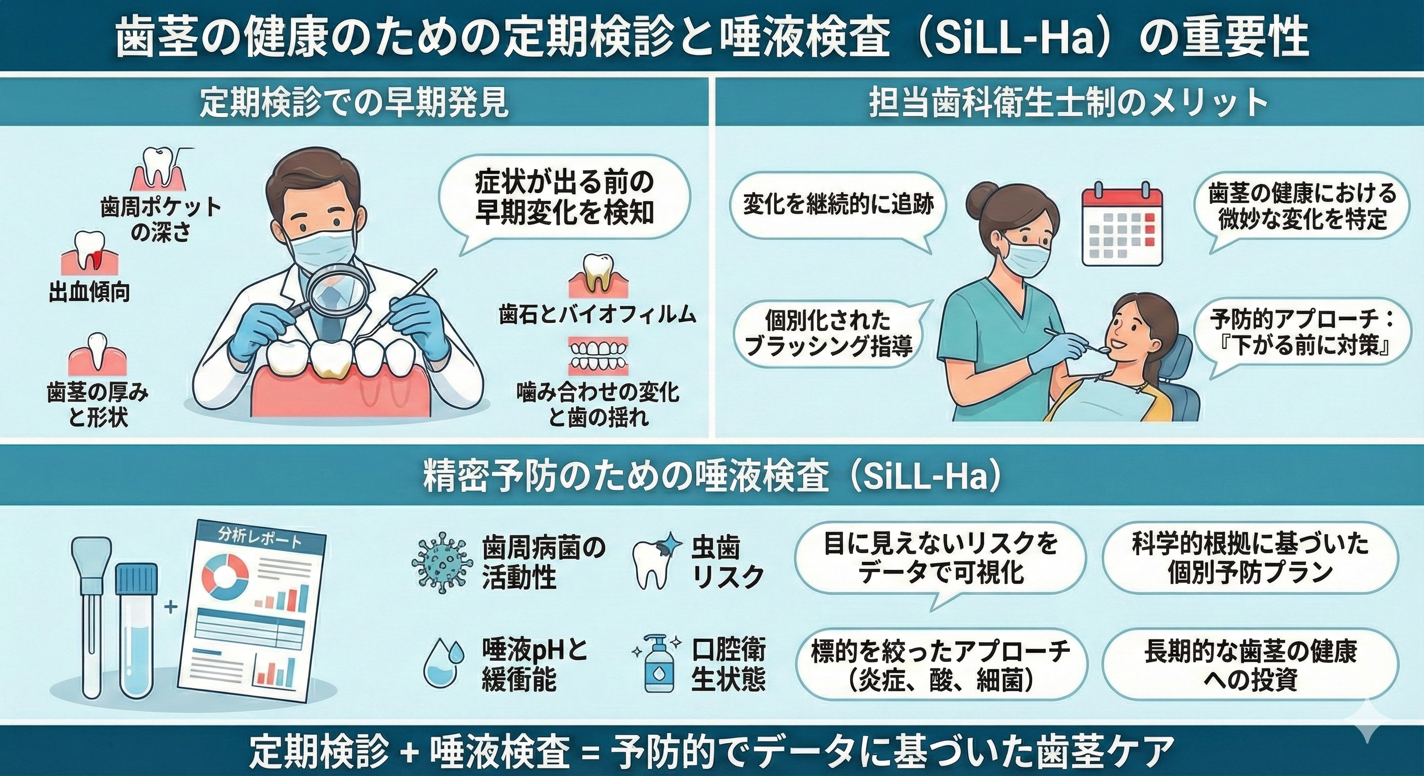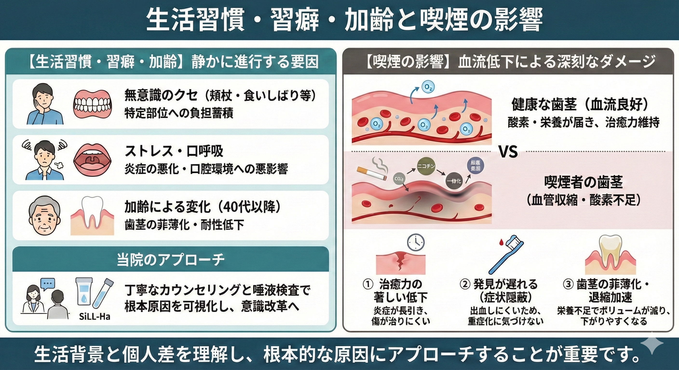 また、SiLL-Ha唾液検査で炎症リスクを可視化し、治療効果の高い順番で改善に取り組める点も大きな強みです。