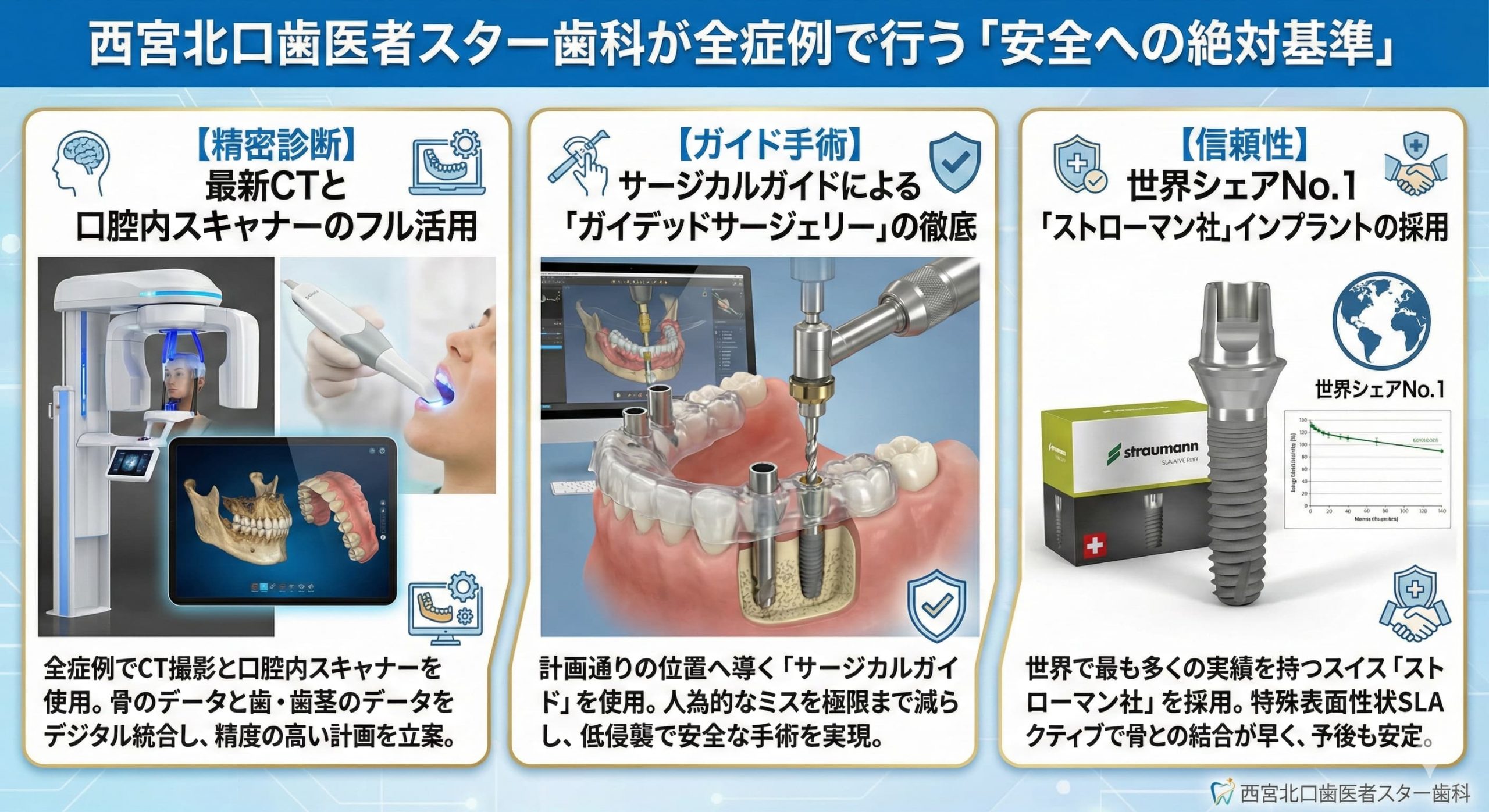 西宮北口スター歯科では、「勘や経験」だけに頼る手術は一切行いません。患者様の安全を最優先にし、確実な結果を出すために、当院が標準化している徹底した安全対策と設備環境についてご紹介します。