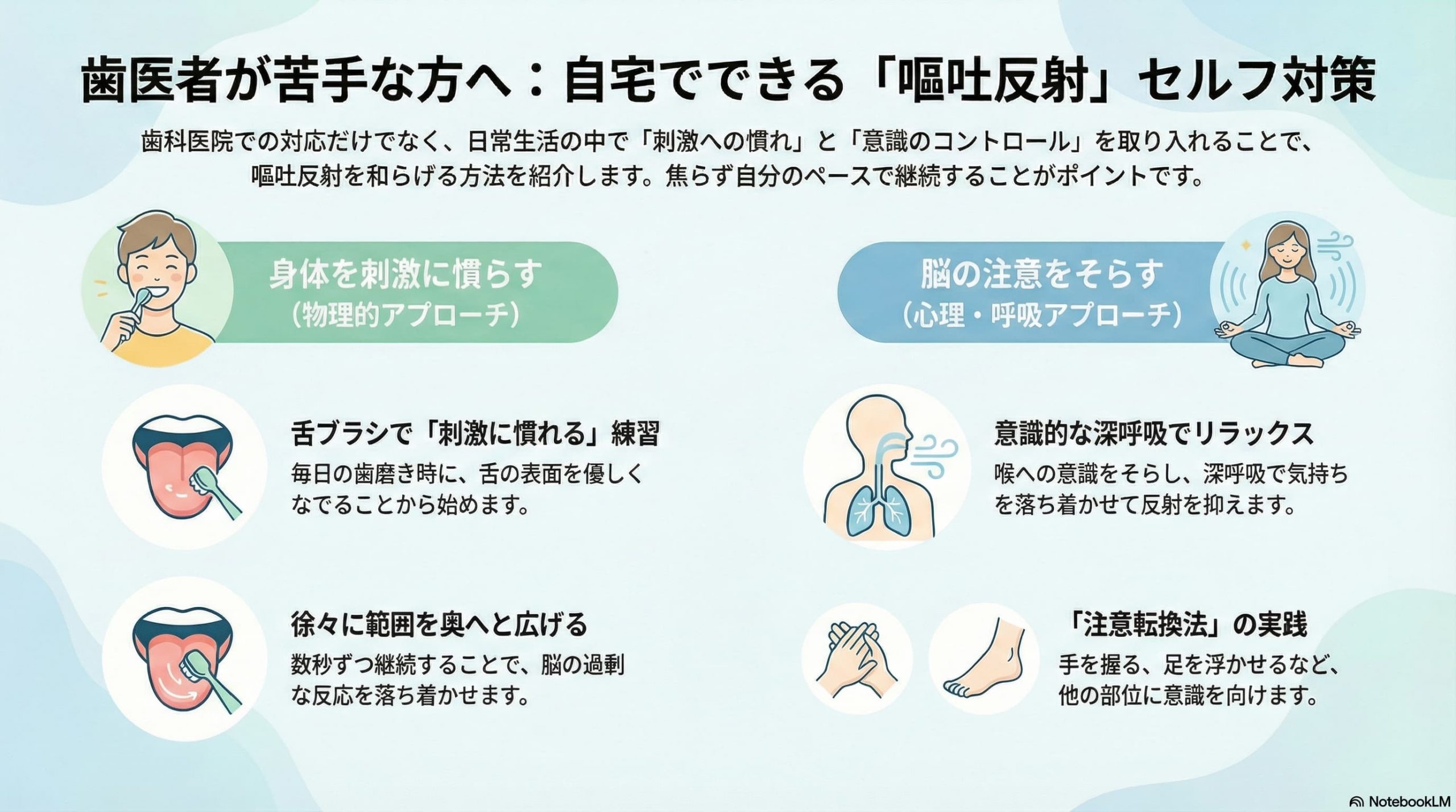 治療中に「喉」に意識が集中すると、余計にえずきやすくなります。えずきそうになったときは、意識的に深呼吸をして気持ちを落ち着かせることで、反射を抑えられる場合があります。、また、手やタオルをぎゅっと握ったり、足を少し浮かせて動かしたりして気をそらすことで「身体の他の部分」に意識を向ける(注意転換法)と、脳の注意が分散され、反射が抑えられる場合があります。