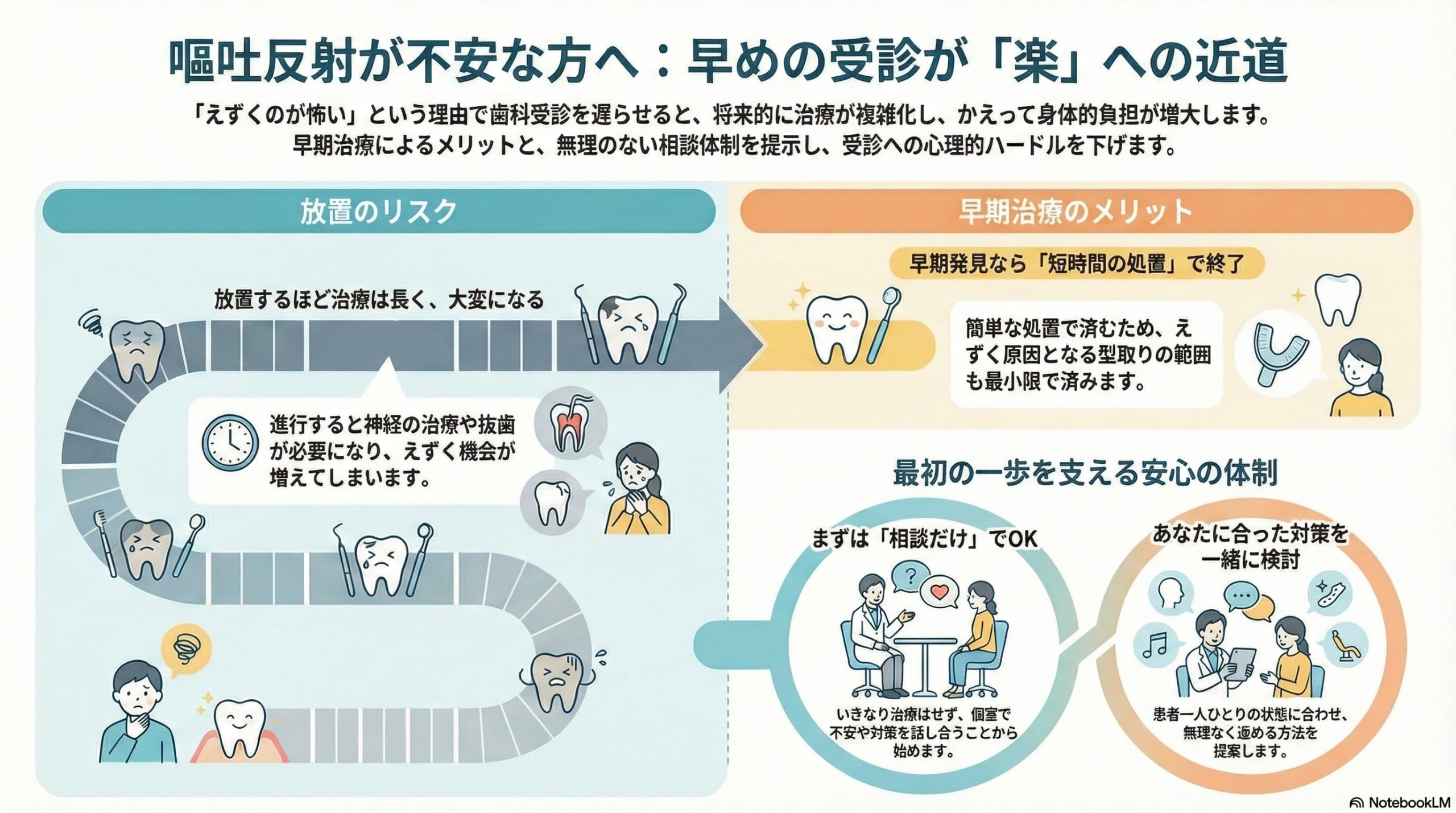「えずくのが怖いから」と歯科受診を先延ばしにすることは、結果として将来の自分を苦しめることになってしまいます。